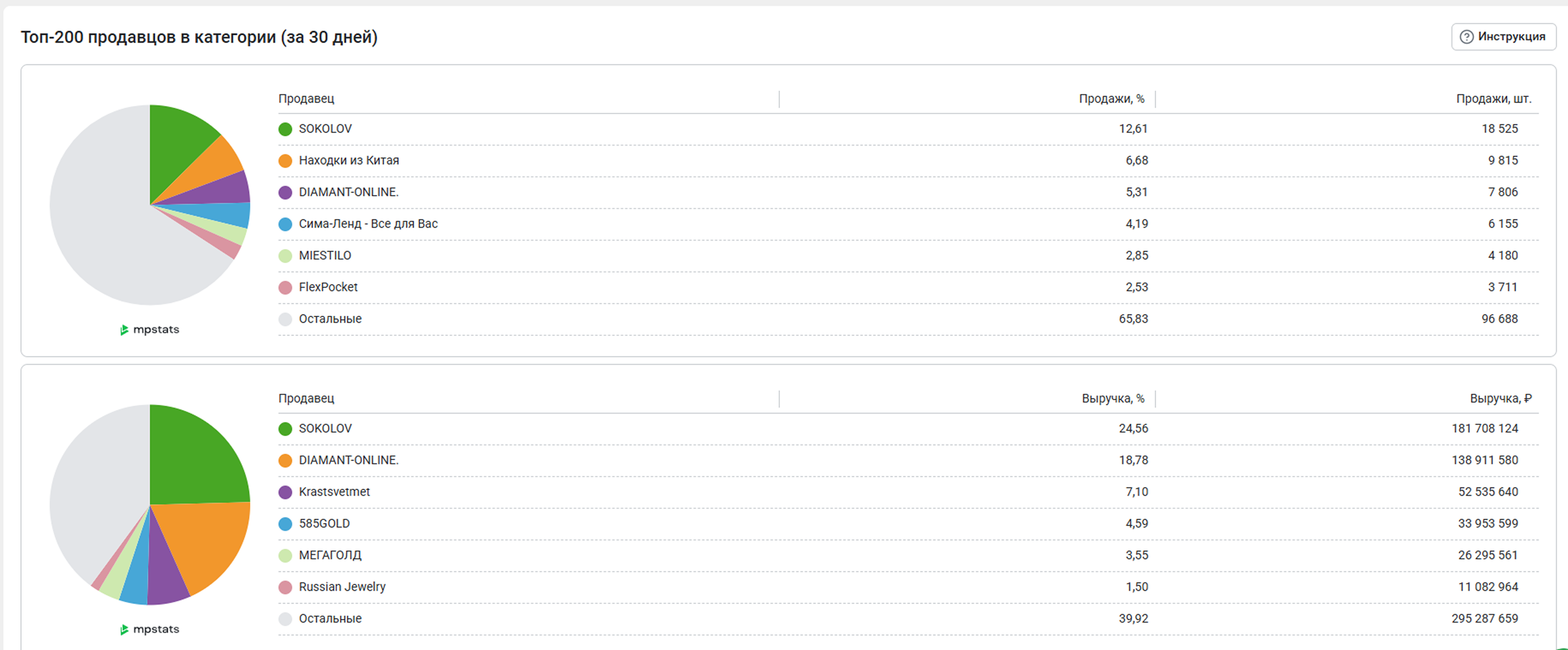 Диаграммы показывают доли первых шести продавцов в выбранной категории. Верхняя диаграмма показывает количество и долю продаж каждого продавца, нижняя – сумму и долю выручки.