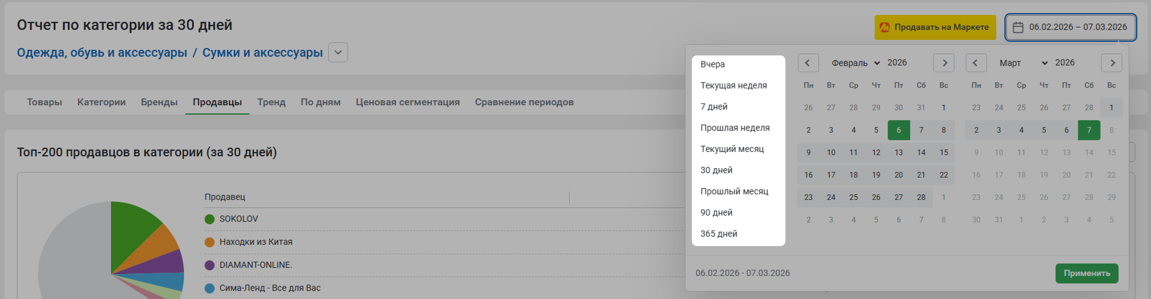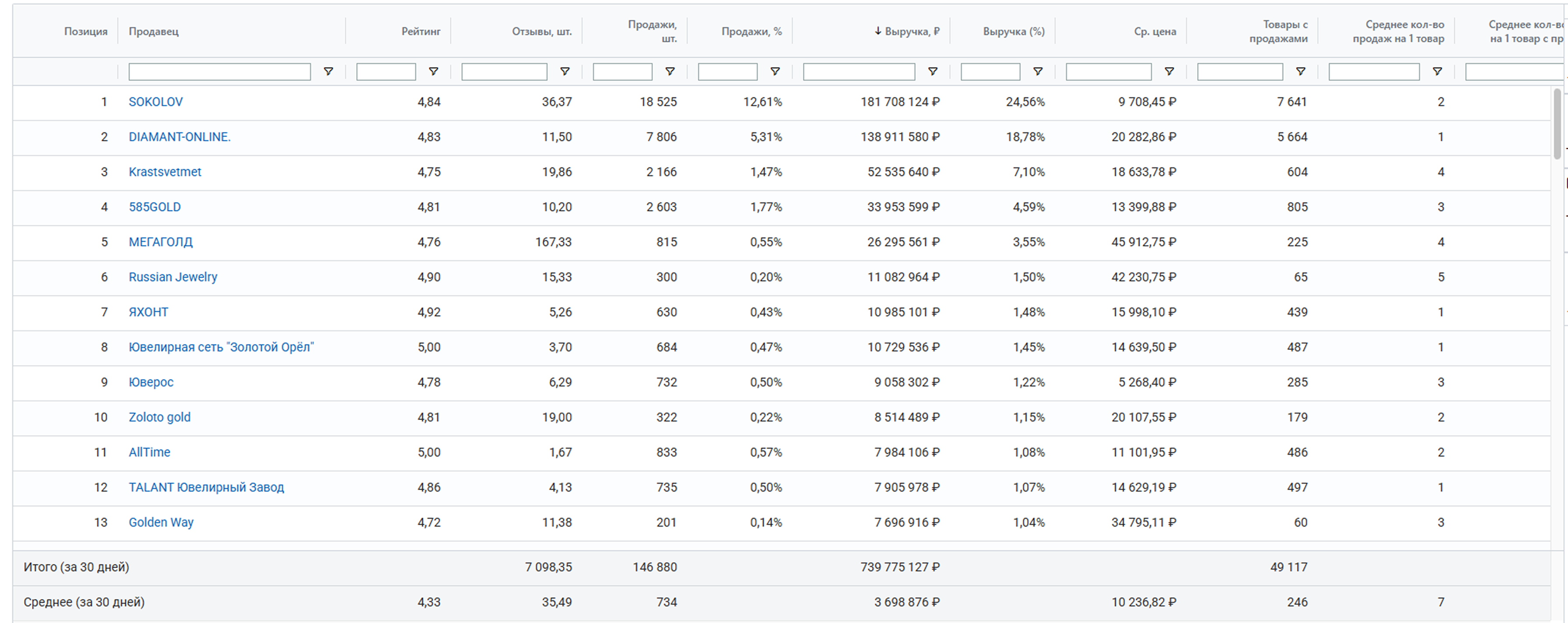 Основную долю рынка по выручке занимают первые 200 продавцов. Система рассматривает категорию в рамках юридических лиц, которые работают в выбранной категории. С помощью Отчета по продавцамвы сможете проанализировать, какие продавцы вошли в топ-200 по выручке за выбранный период. Здесь можно увидеть подробную статистику по доле продавца в анализируемой категории.