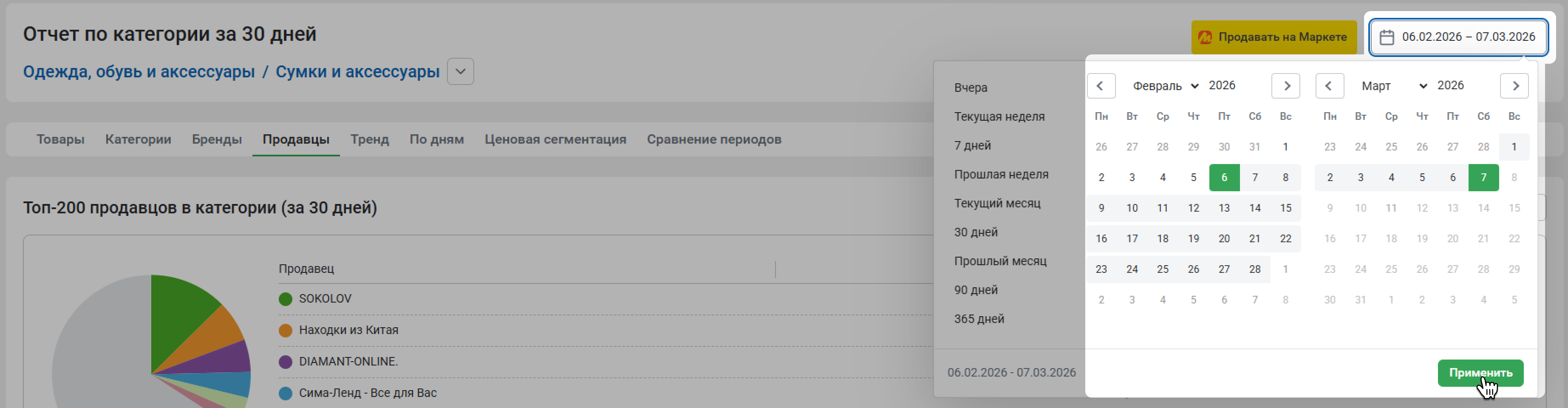 Продажи (%) – доля продаж продавца в процентах от общих продаж в этой категории за выбранный период