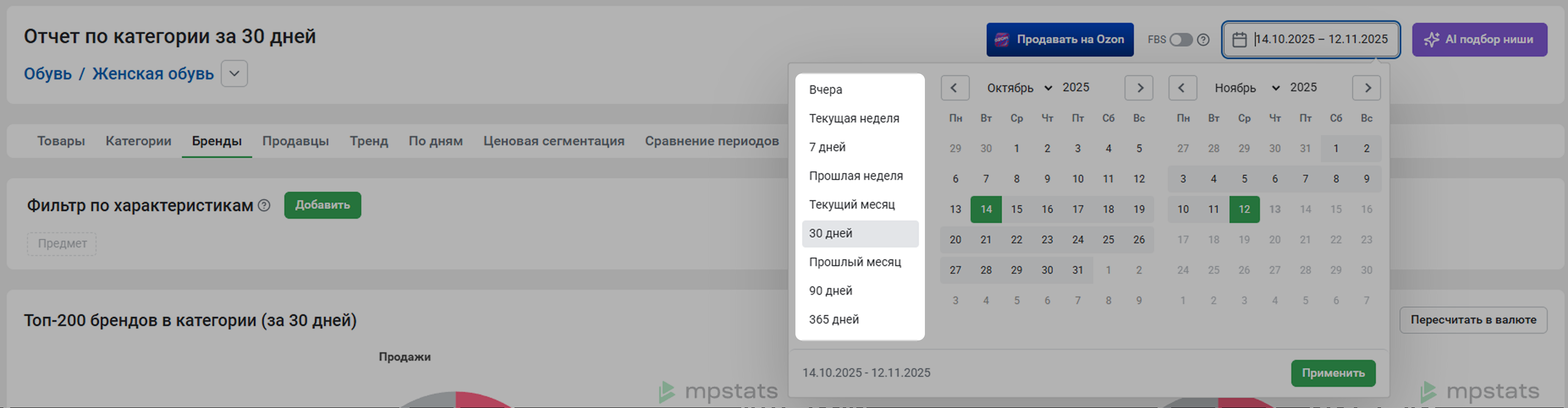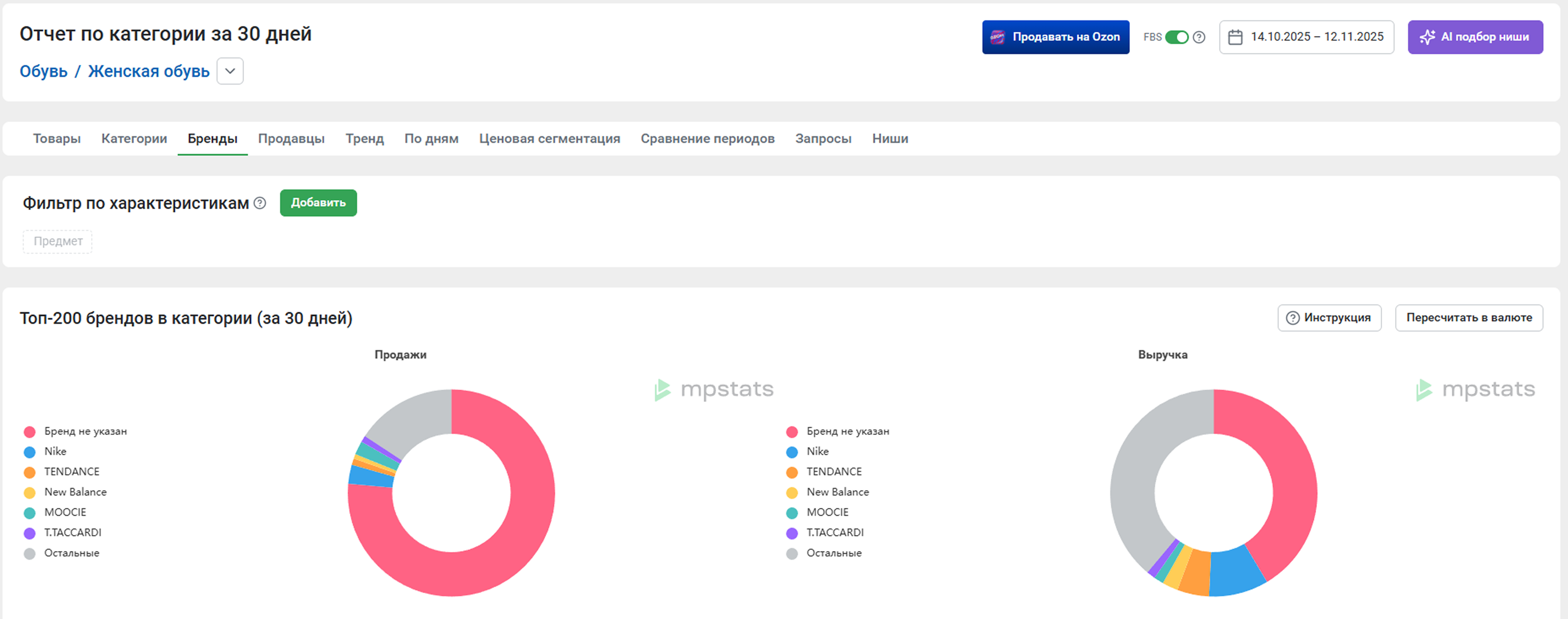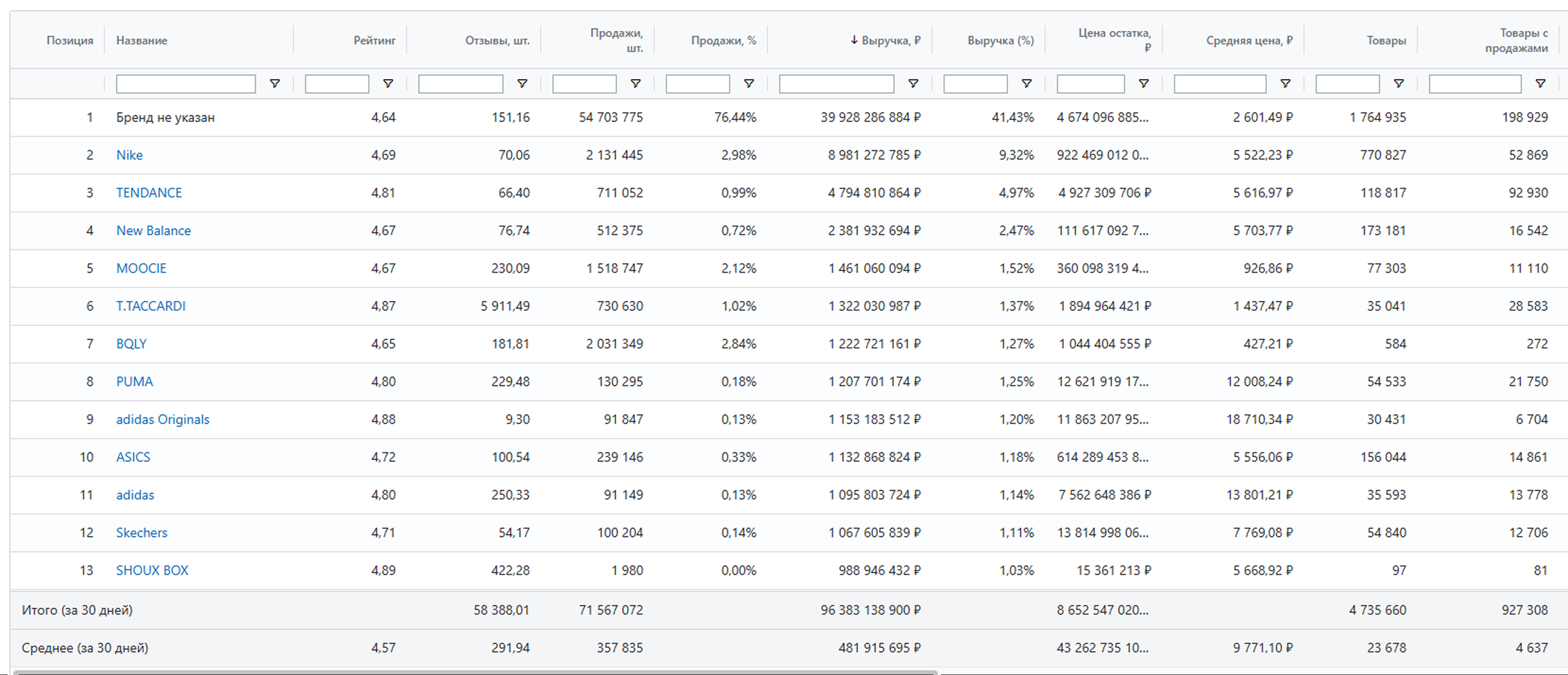 Отчет по брендам показывает, какие бренды вошли в топ-200 по выручке за выбранный период. Здесь можно увидеть подробную статистику по доле бренда в анализируемой категории.