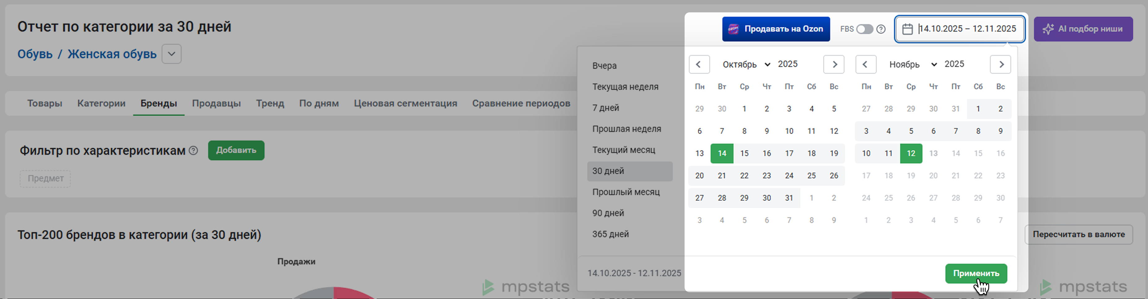 Автоматически отчет формируется за последние 30 дней, но вы можете выбрать другой период. Нажмите на поле со значком календаря и выберите временной промежуток. Нажмите Применить.