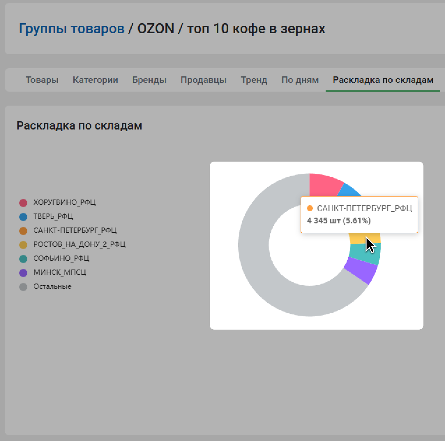 Отчет Раскладка по складам показывает информацию о текущих остатках товаров по тем складам, которые использует продавец или бренд. Отчет покажет, куда отгружают товар конкуренты, добавленные в группу – вы сможете определить возможный спрос на товар и понять, куда отгружать свои товары. Данные о складах и остатках отображаются на диаграмме и в виде таблицы.