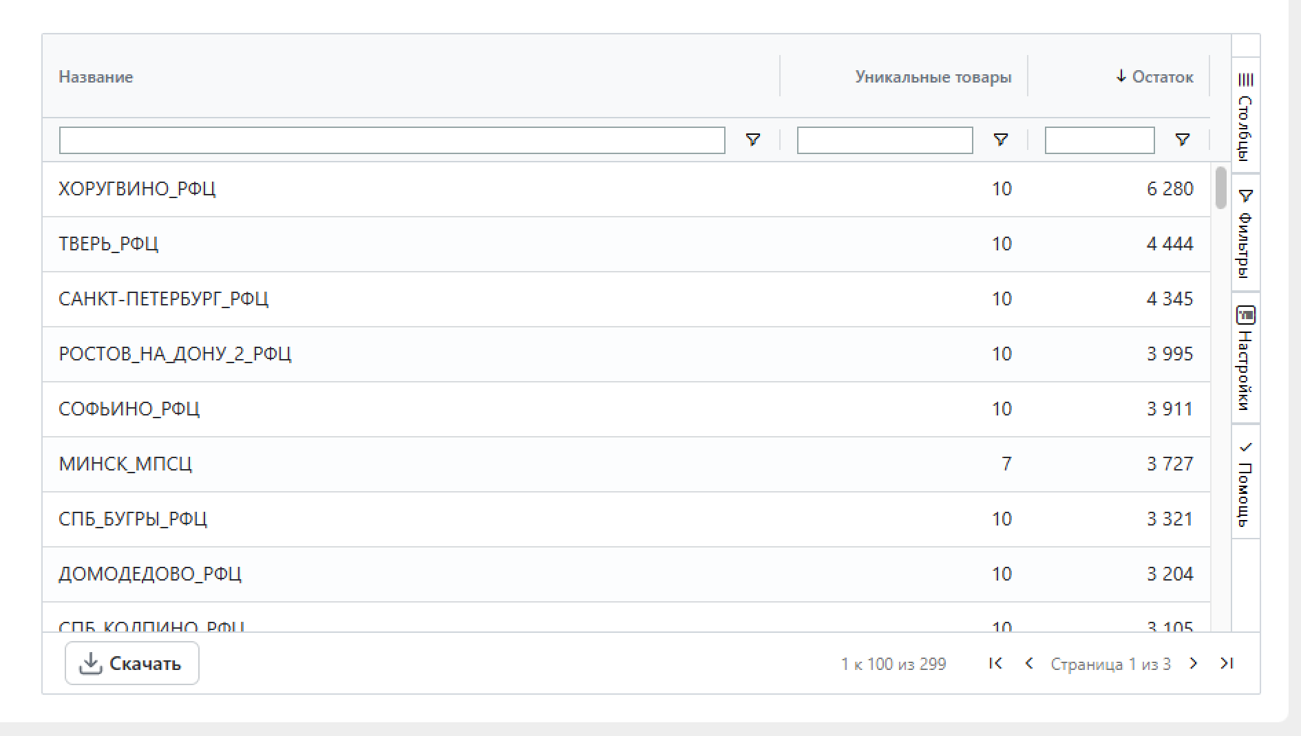 Чтобы отфильтровать данные в таблице по конкретному складу, введите его название.