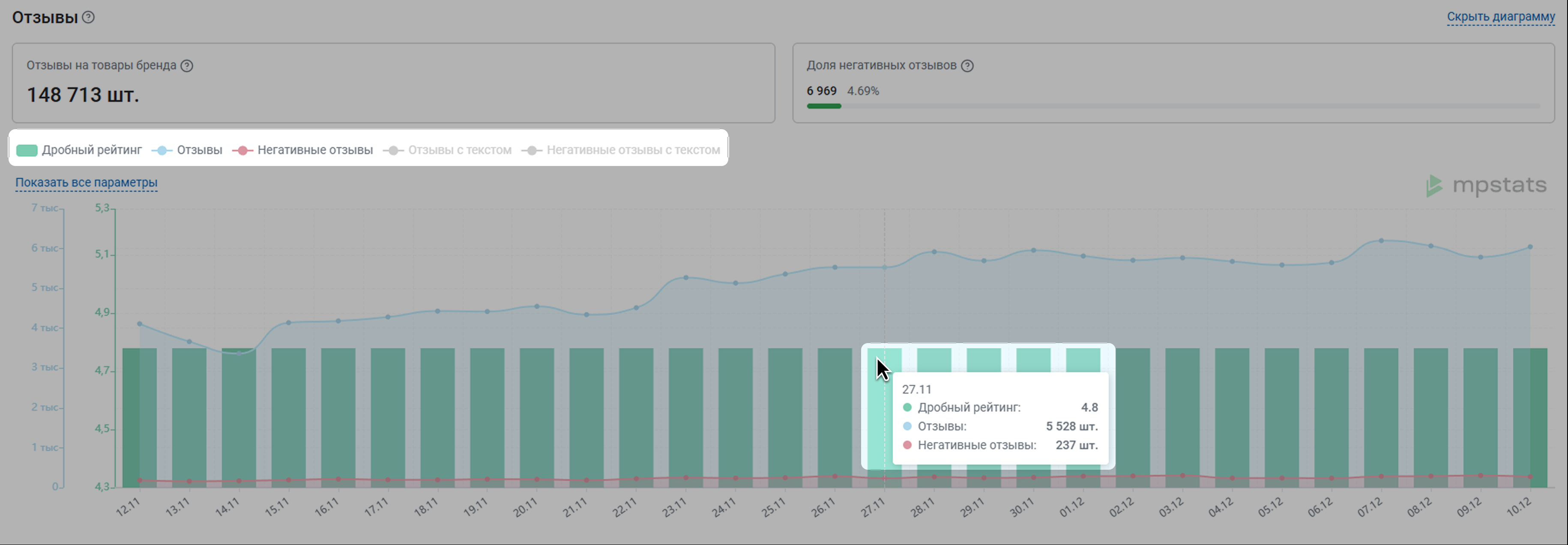 Под сводкой есть график с количеством отзывов за каждый день выбранного периода. С его помощью удобно просматривать, как соотносится количество негативных отзывов и общее число отзывов, или отслеживать взаимосвязь рейтинга товара и отзывов на него.