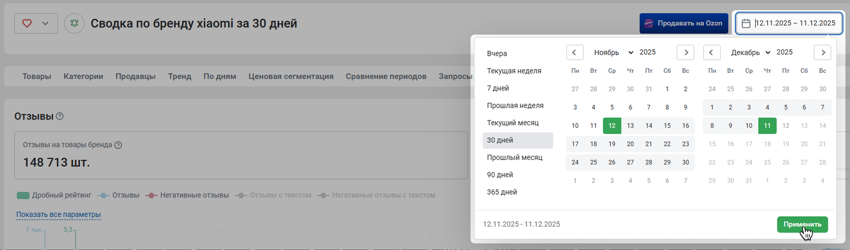 Автоматически отчет формируется за последние 30 дней, но вы можете выбрать другой период. Нажмите на поле со значком календаря и выберите временной промежуток. Нажмите Применить.