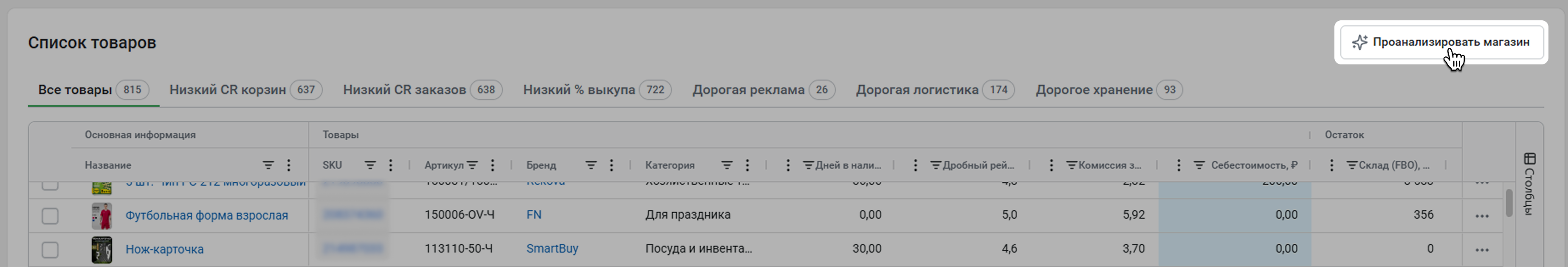 Перейдите в Кабинет WB → Товары. Над таблицей с товарами нажмите Проанализировать магазин.