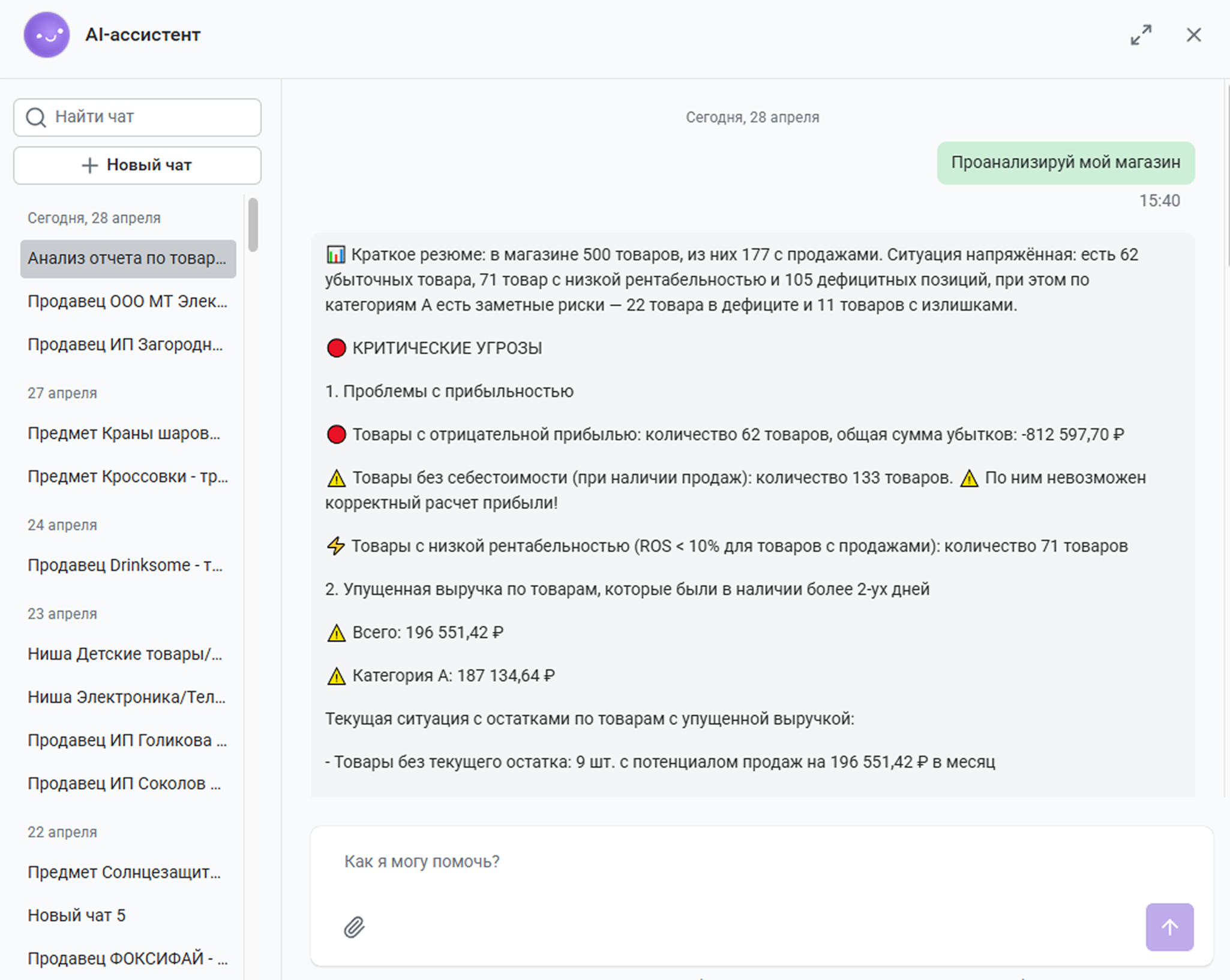 Ассистент проанализирует ваш магазин и оценит прибыль, рентабельность, упущенную выручку и дефицит товаров. Если есть критические отклонения – он укажет на них и даст практические рекомендации, как их устранить.