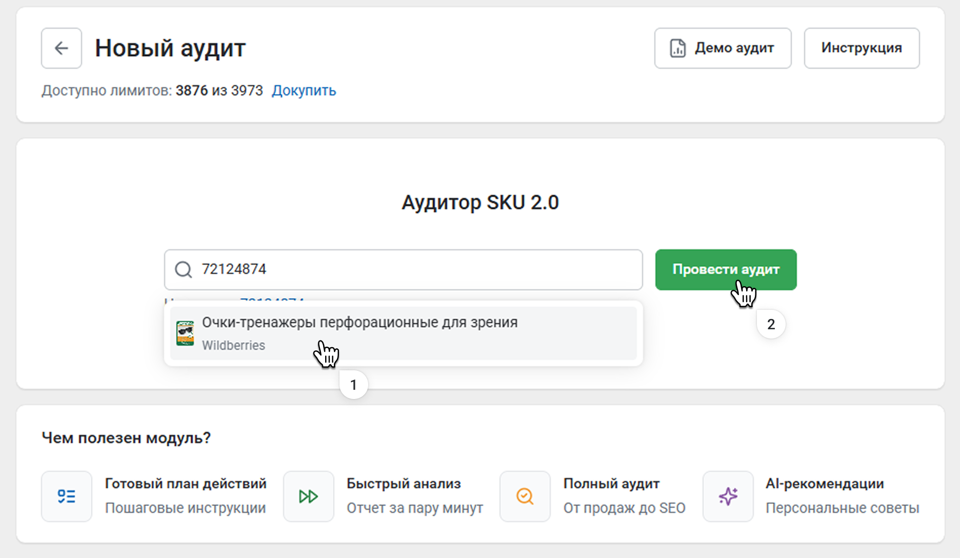 Каждый новый аудит расходует лимиты – и на Wildberries, и на Ozon. В инструменте доступно 10 аудитов – если этого количества не хватило, можно их докупить. Подробнее об этом читайте в статье Лимиты в модулях MPSTATS.
