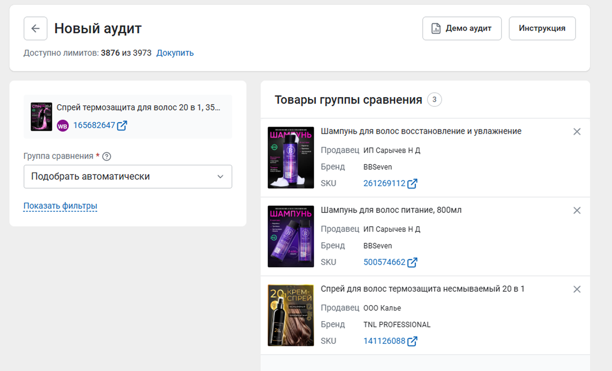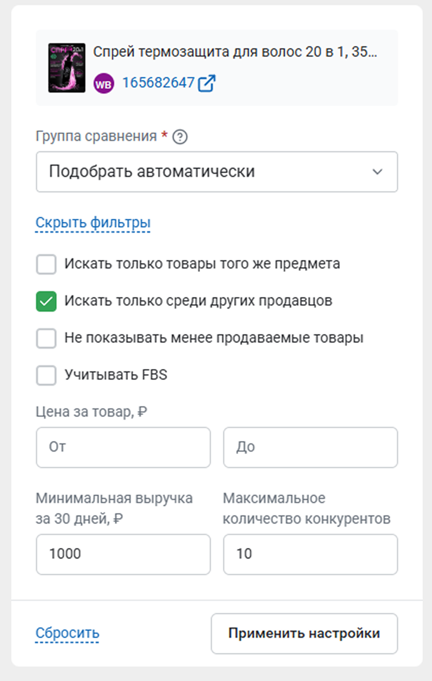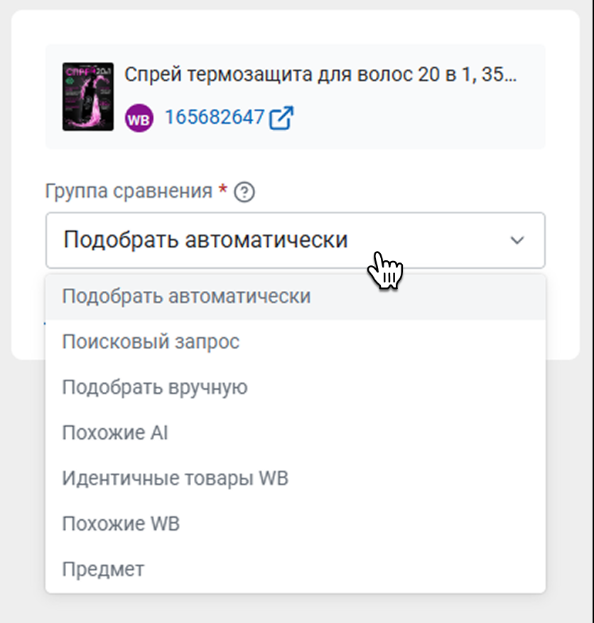 Инструмент автоматически подберет группу сравнения – товары, с которыми он будет сравнивать вашу карточку.