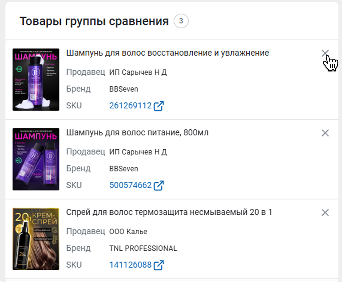 Система покажет вам подобранные товары. Если вам не подходит какой-то товар, нажмите на крестик, чтобы убрать его из сравнения.