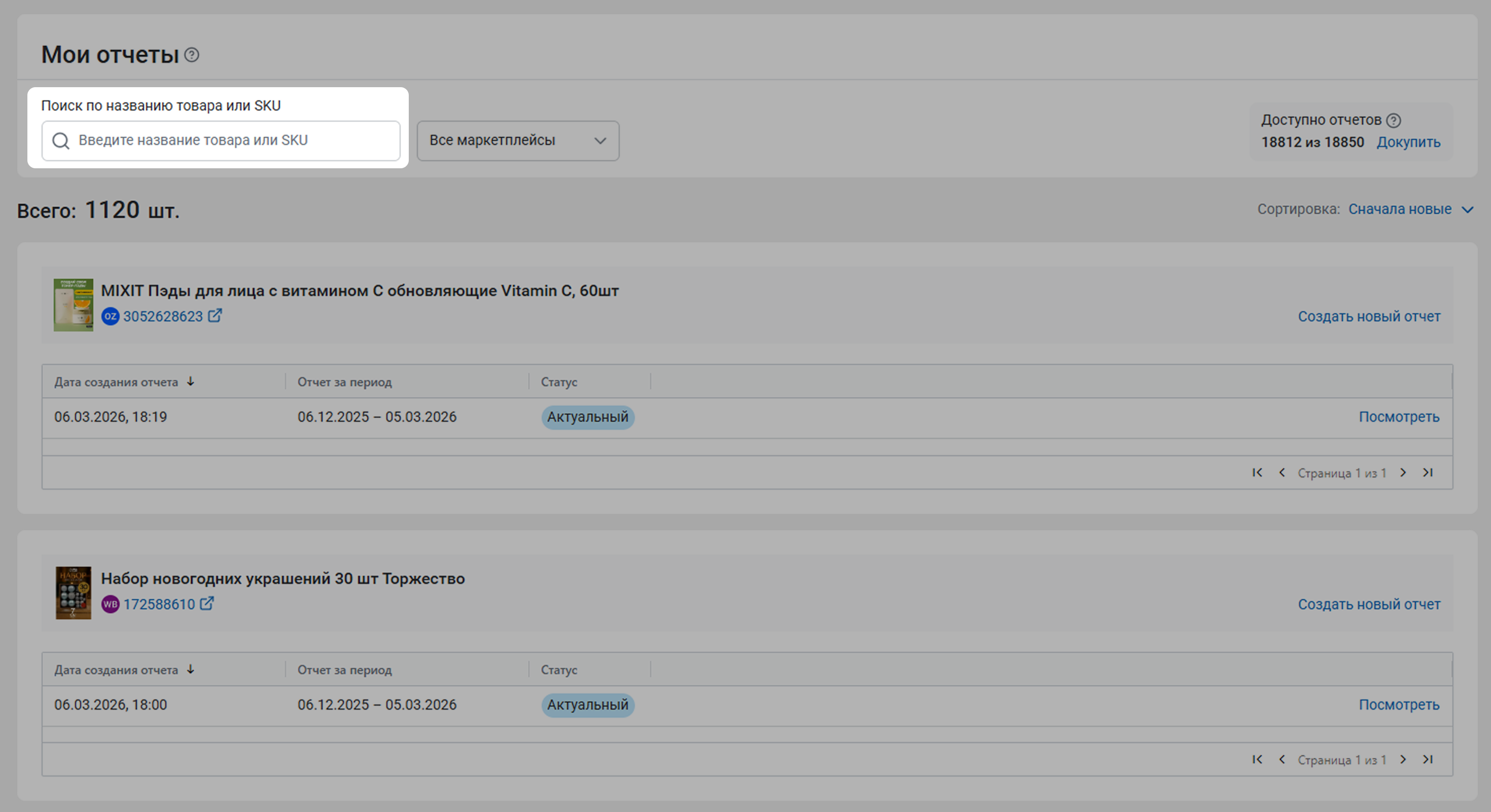 Вы можете быстро находить нужные отчеты с помощью строки поиска. Искать отчет можно по SKU или названию товара.