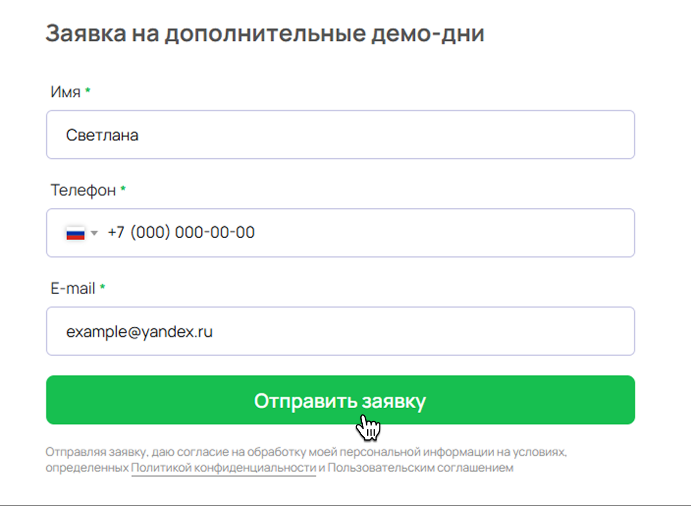 Зарегистрируйтесь в сервисе или заполните заявку на сайте. В ней укажите свои имя, телефон и электронную почту. Нажмите Активировать демо-доступ.