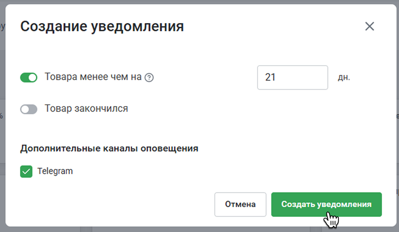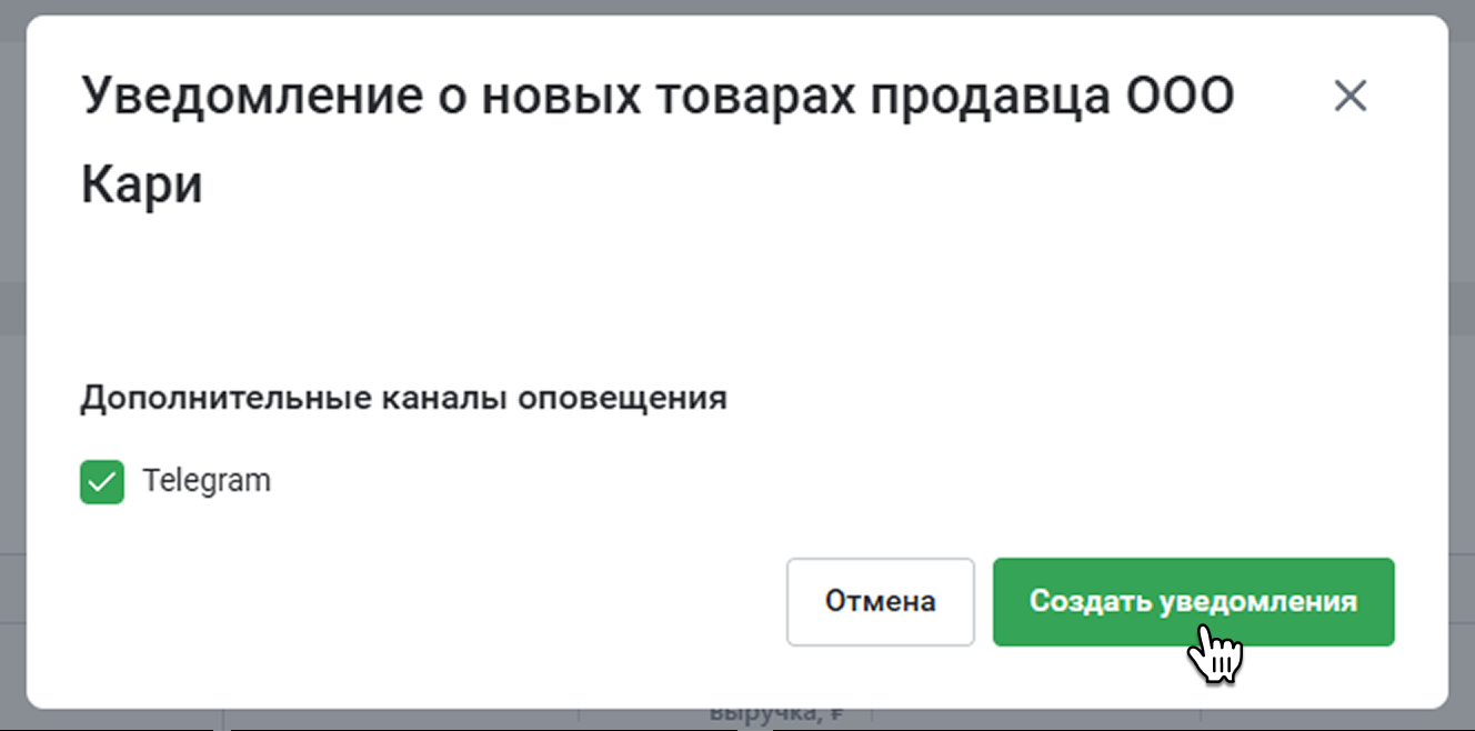 В открывшемся окне укажите, хотите ли вы получать уведомления в Telegram, и нажмите Создать уведомления.