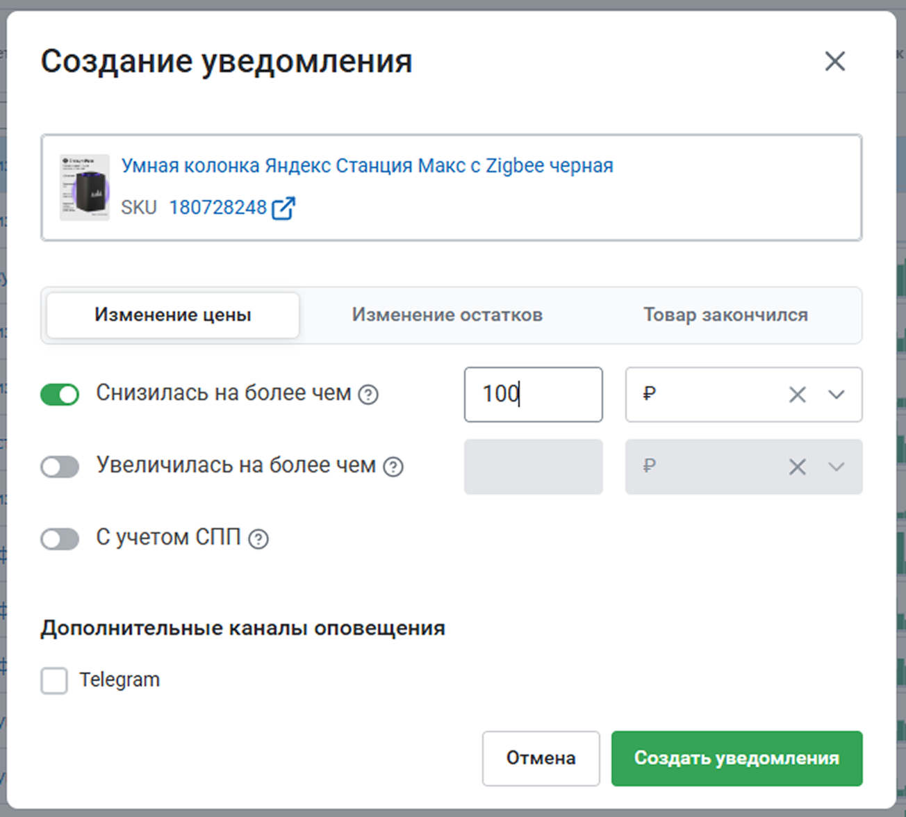 Уведомления об изменениях цены могут быть в рублях и процентах
