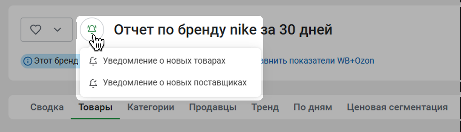 Оповестим, если у бренда появятся новые товары или его товары начнет продавать новый селлер. Нажмите на колокольчик рядом с любым брендом в Отчете по брендам Wildberries или Отчете по брендам Ozon.