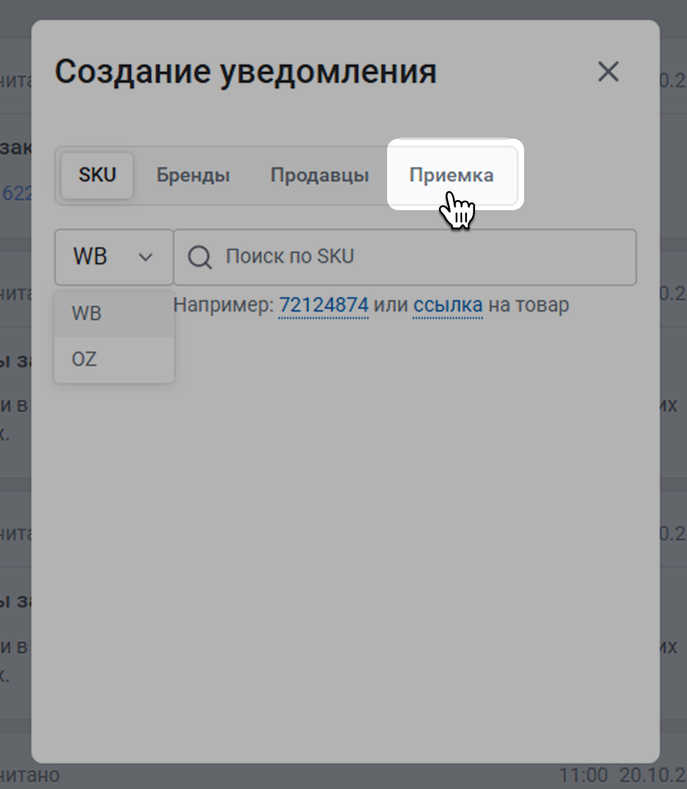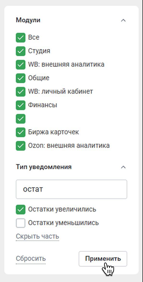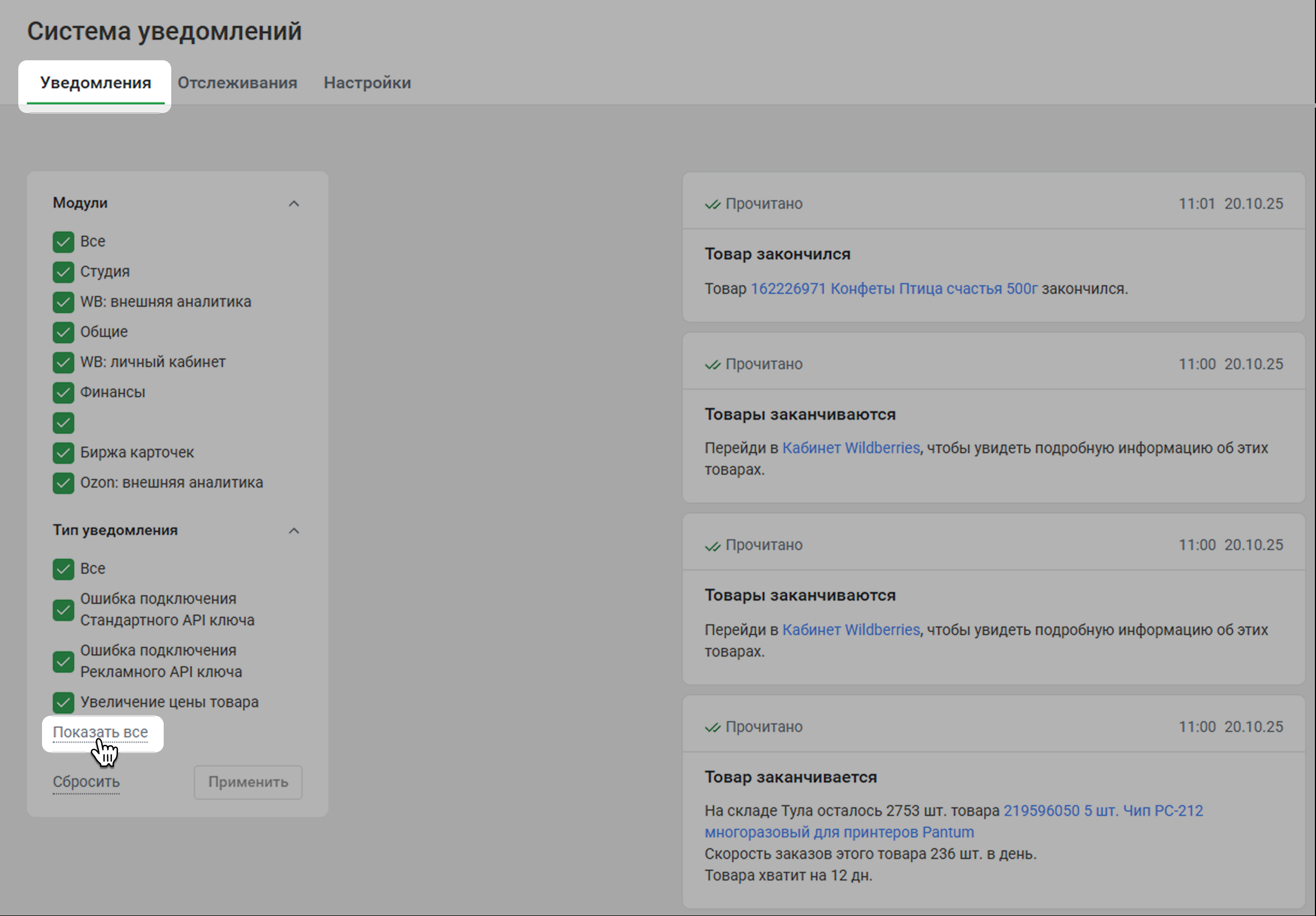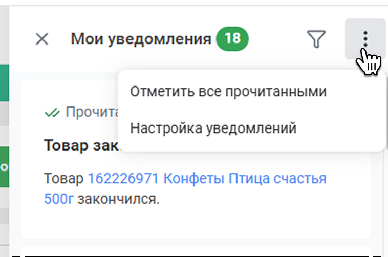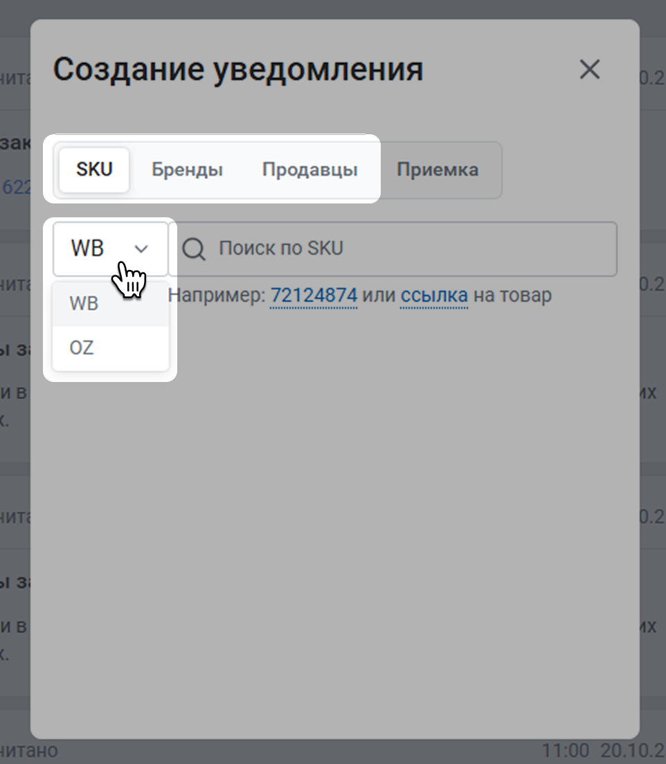 Вы можете переключаться между уведомлениями Ozon и Wildberries и выбирать, какие уведомления показать.