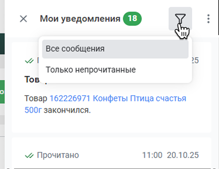 Здесь вы можете отфильтровать их: смотреть все уведомления или только непрочитанные.