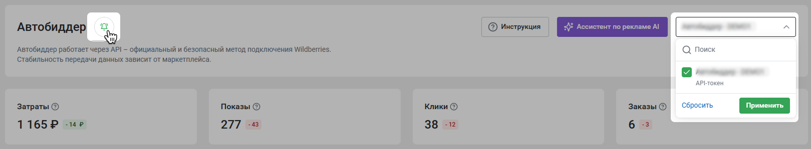Для этого выберите одно подключение нажмите на колокольчик рядом с Автобиддером.