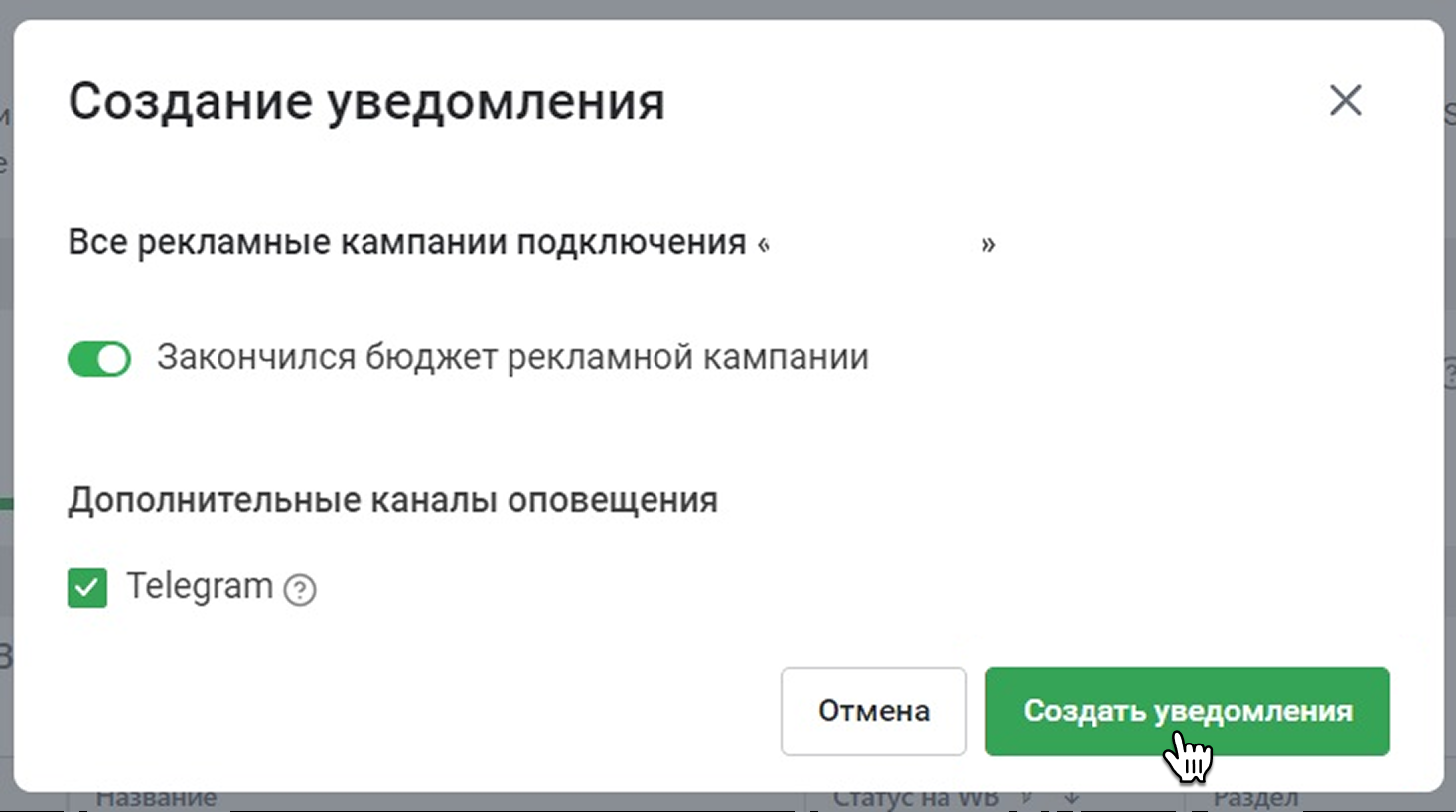 Сделайте активным переключатель Закончился бюджет рекламной кампании и нажмите Создать уведомления.