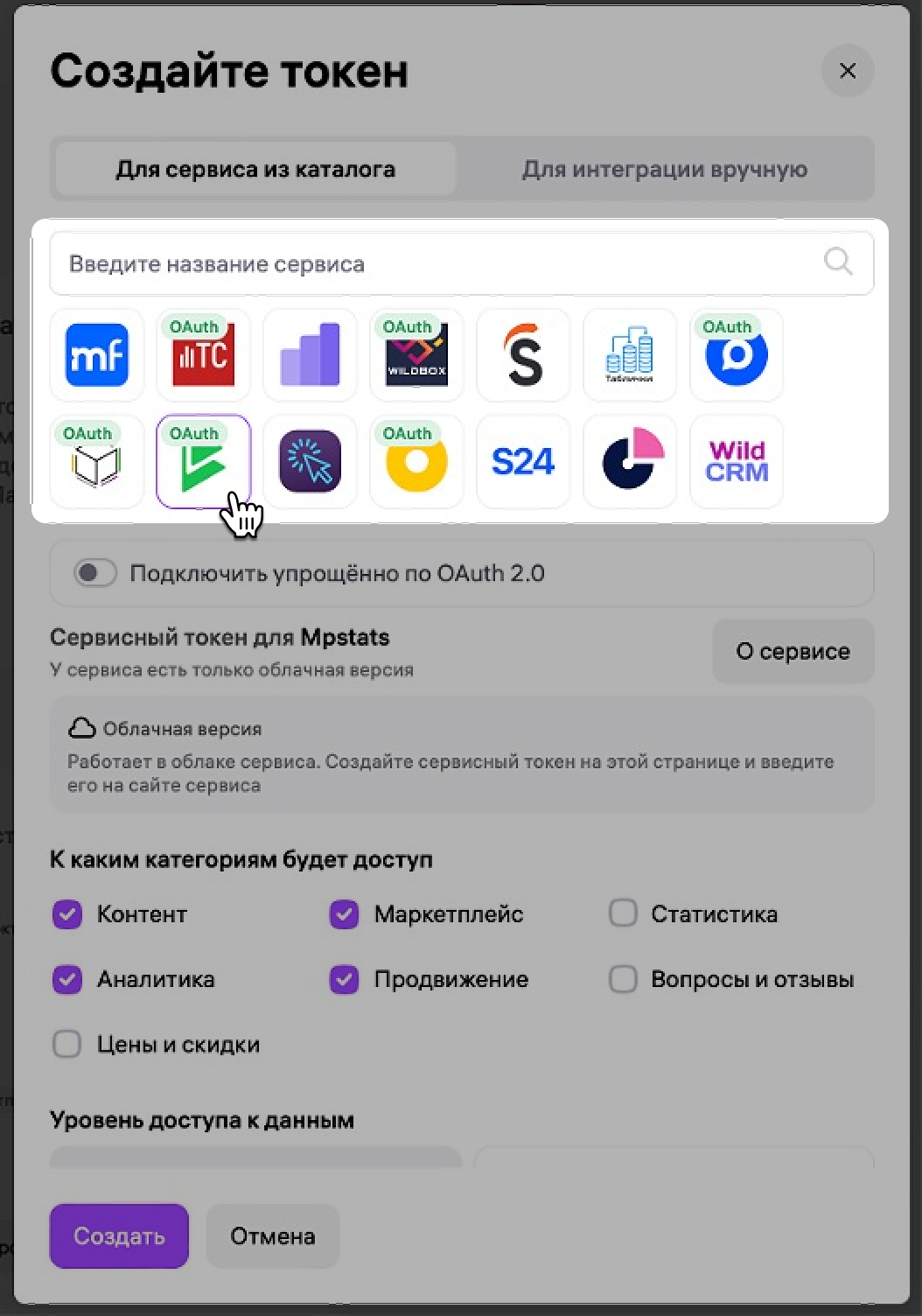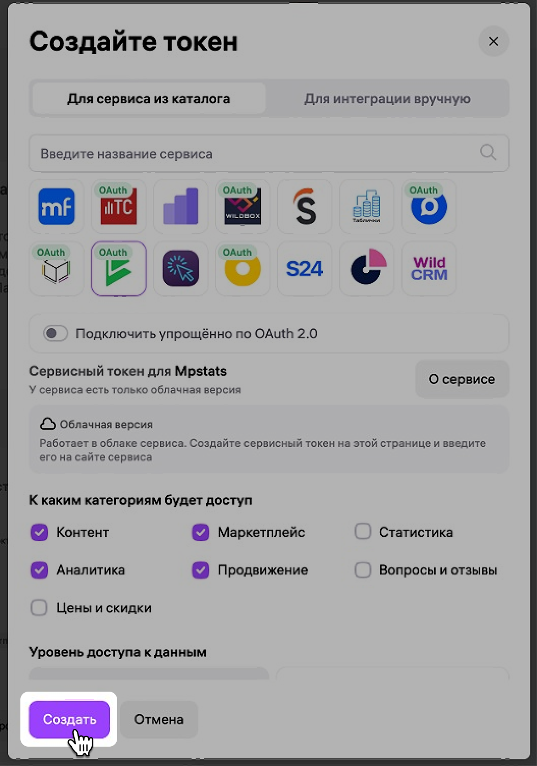 Отметьте галочками категории, к которым нужен доступ: Контент, Маркетплейс, Продвижение, Аналитика.