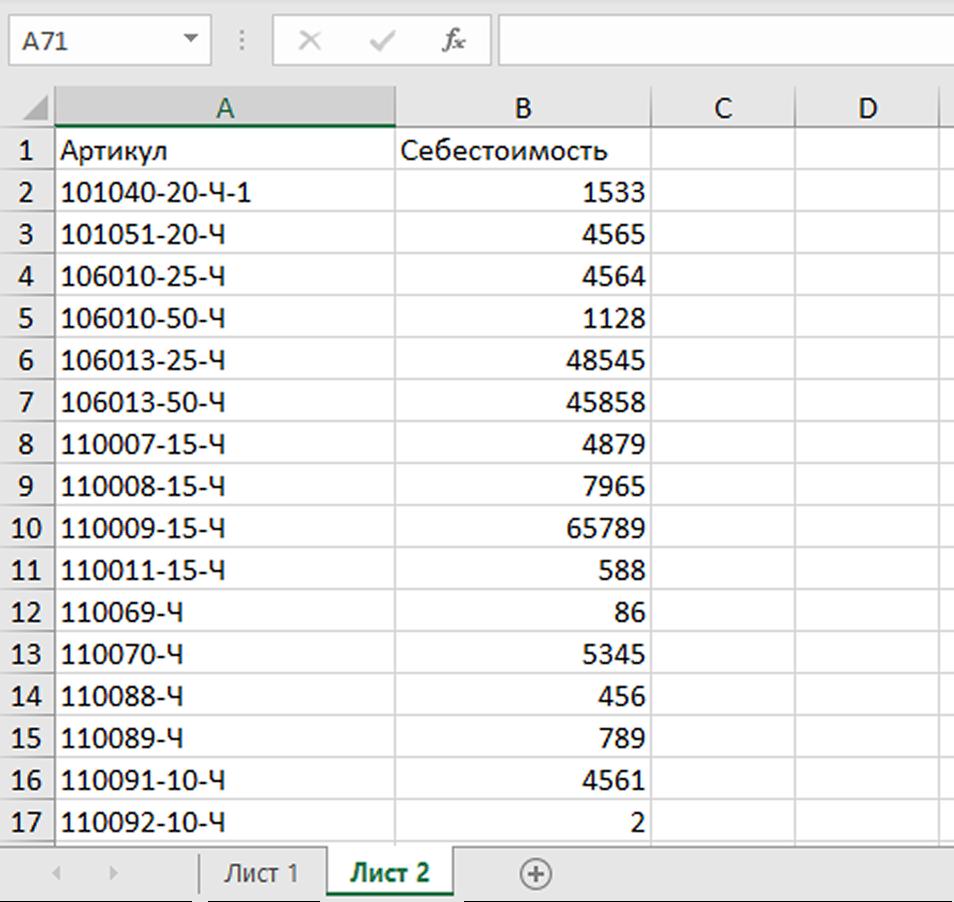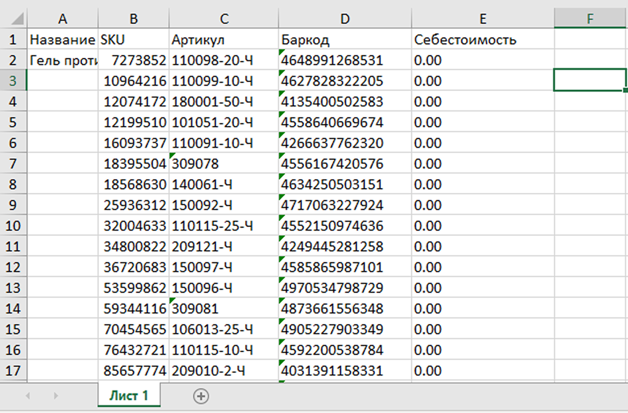 1. Скачайте шаблон с товарами из инструмента – выше рассказано, как это сделать. Откройте файл – в нем будут ваши артикулы с нулевой себестоимостью.
