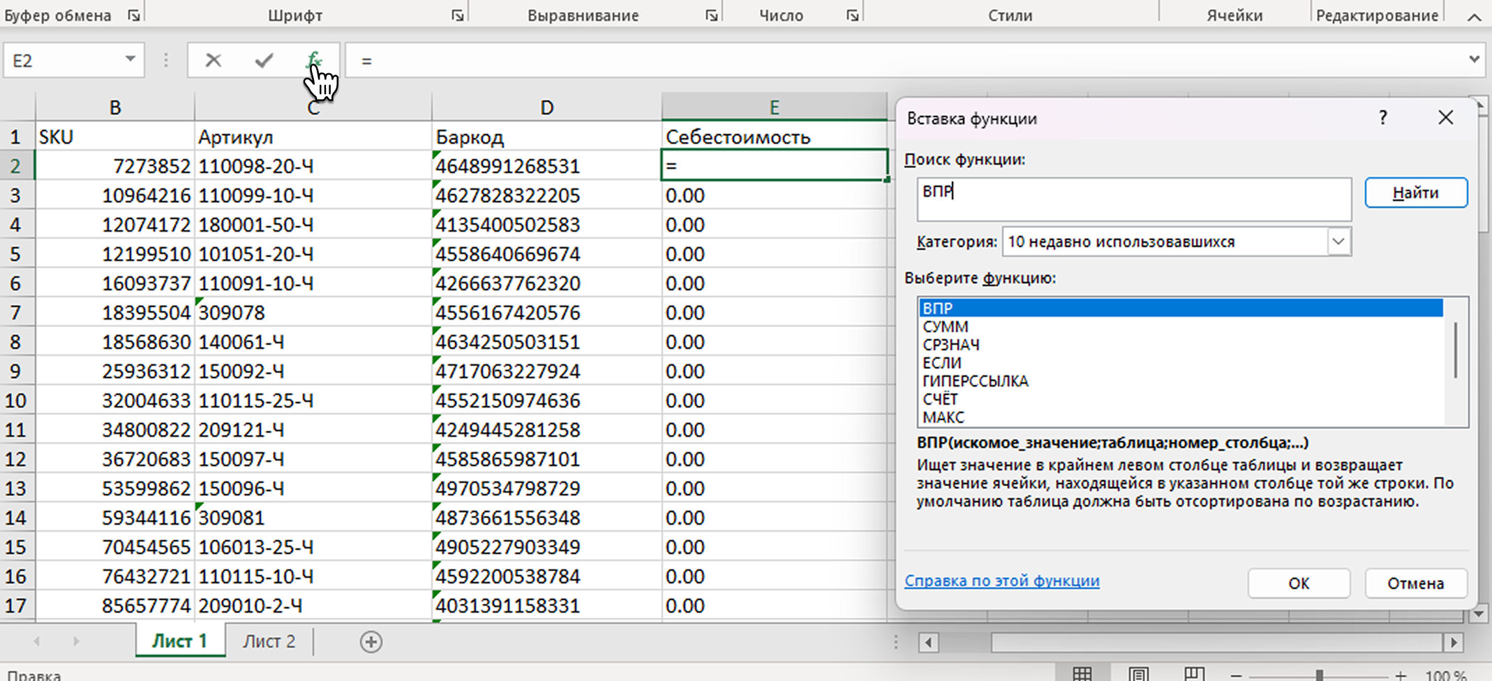 3. Чтобы перенести себестоимость из Листа 2 в Лист 1, нам понадобится функция ВПР. Поставьте курсор в ячейке с себестоимостью первого товара. Нажмите fx и найдите функцию ВПР.