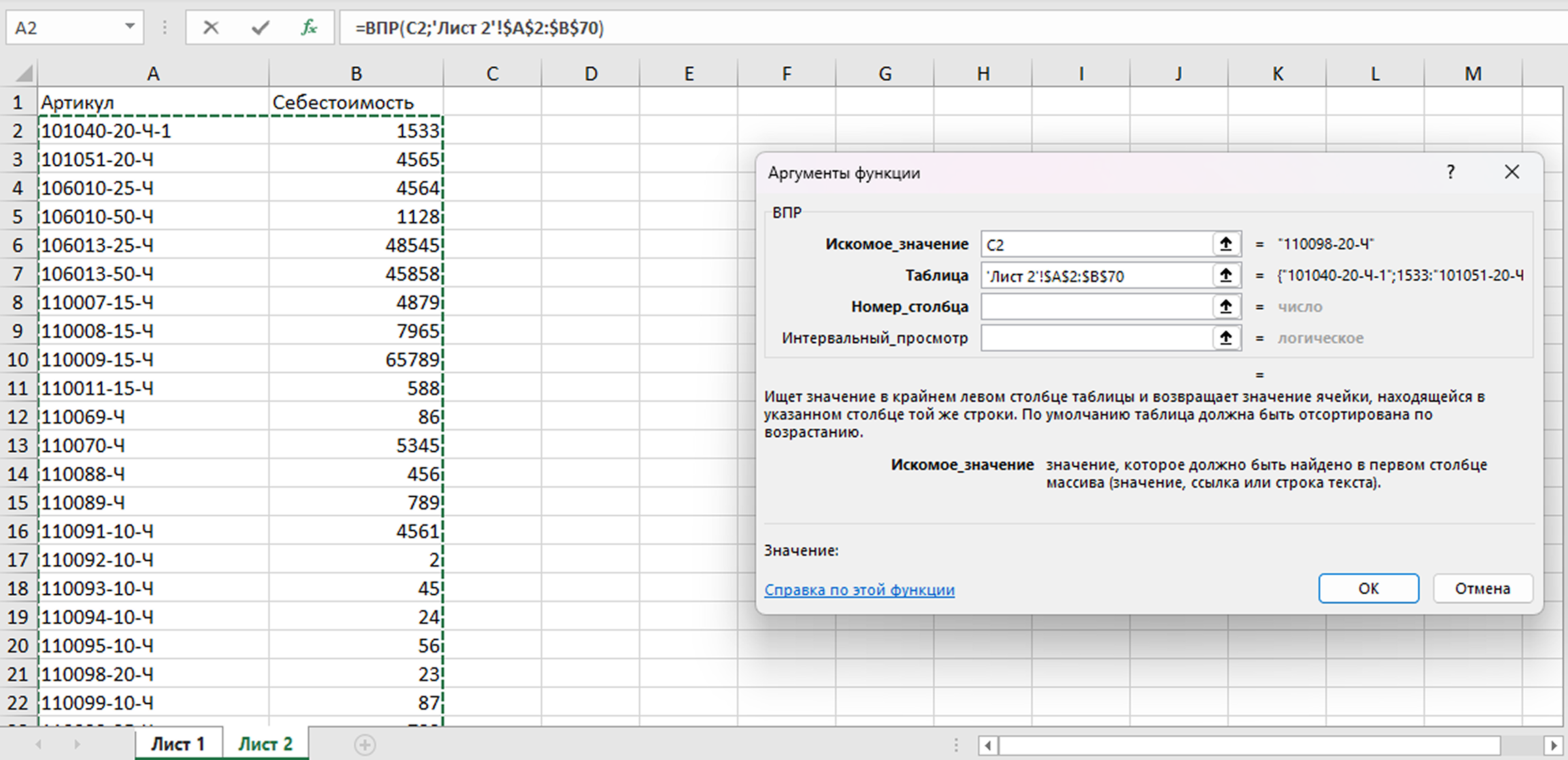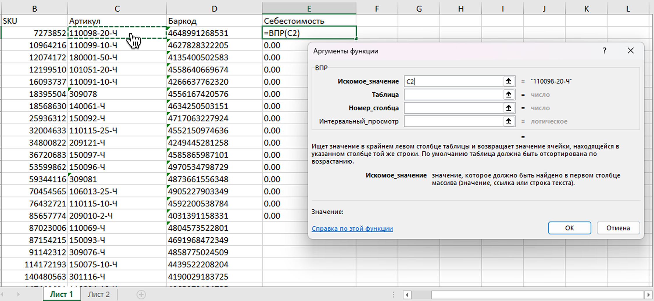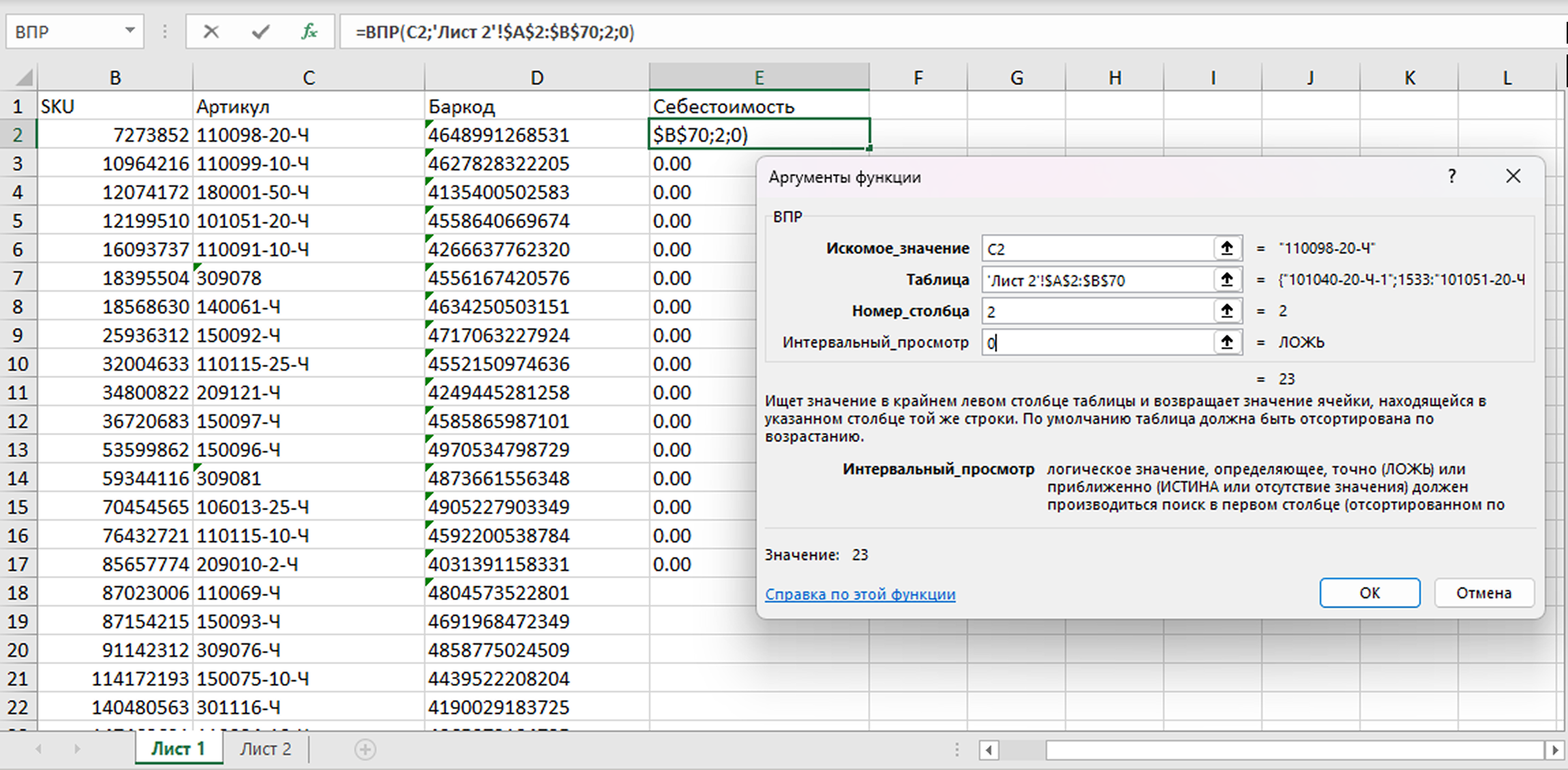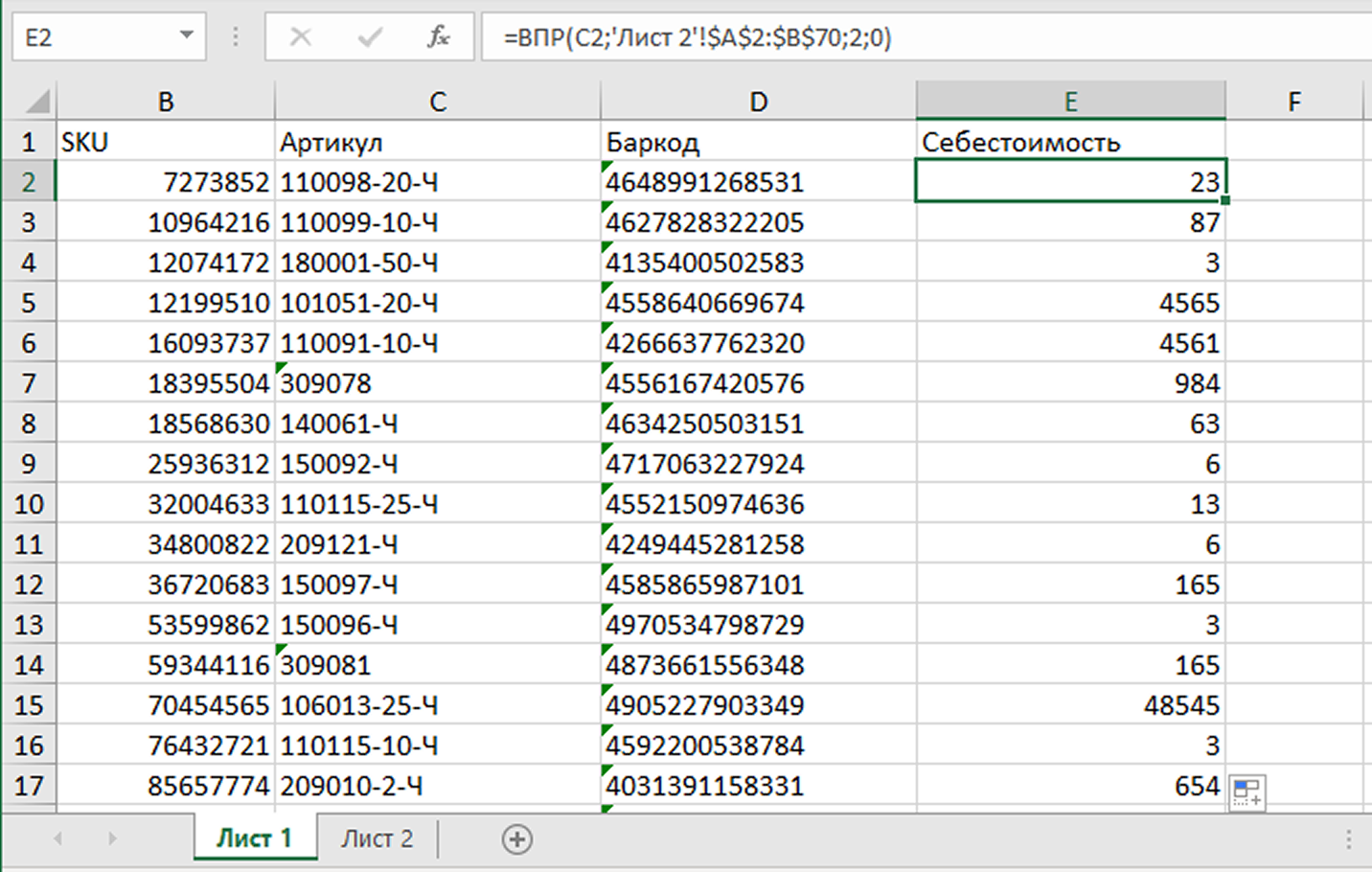 5. Excel найдет на Листе 2 себестоимость для первого артикула и перенесет ее в Лист 1. Протяните формулу на ячейки ниже – и себестоимость всех товаров перенесется на Лист 1. Все готово – себестоимость товаров можно загружать в MPSTATS.
