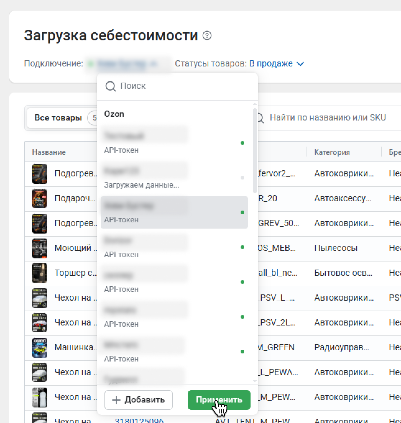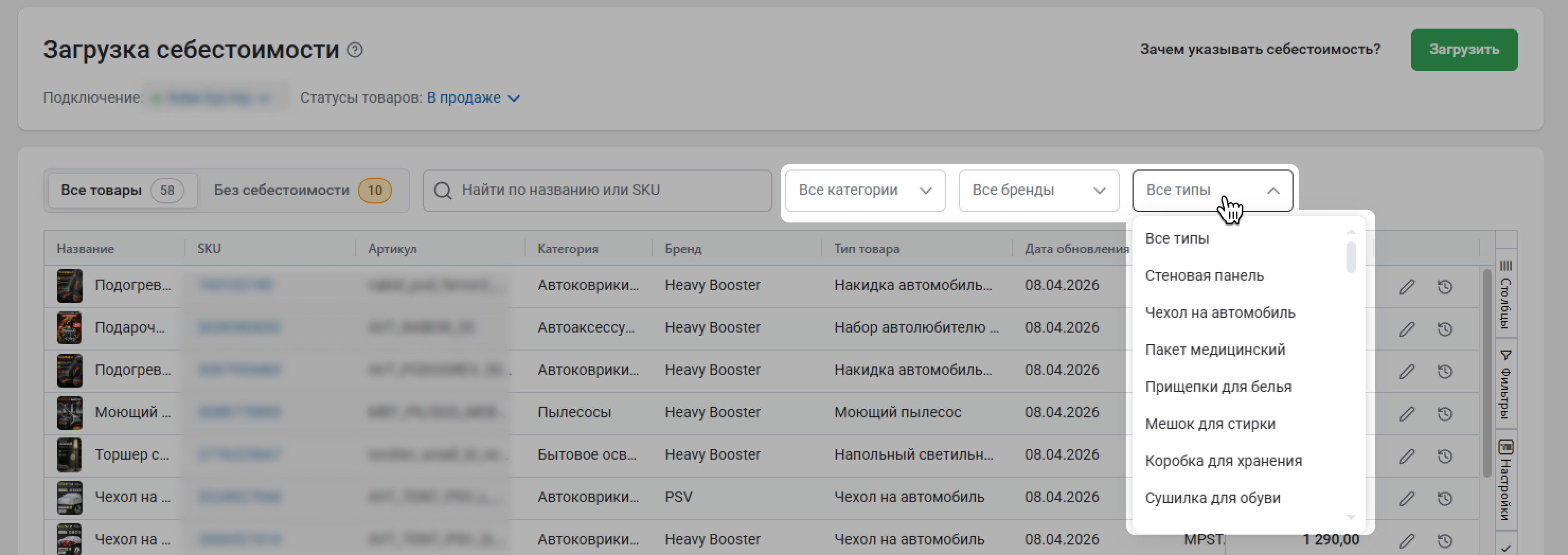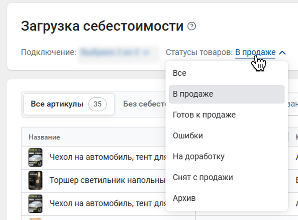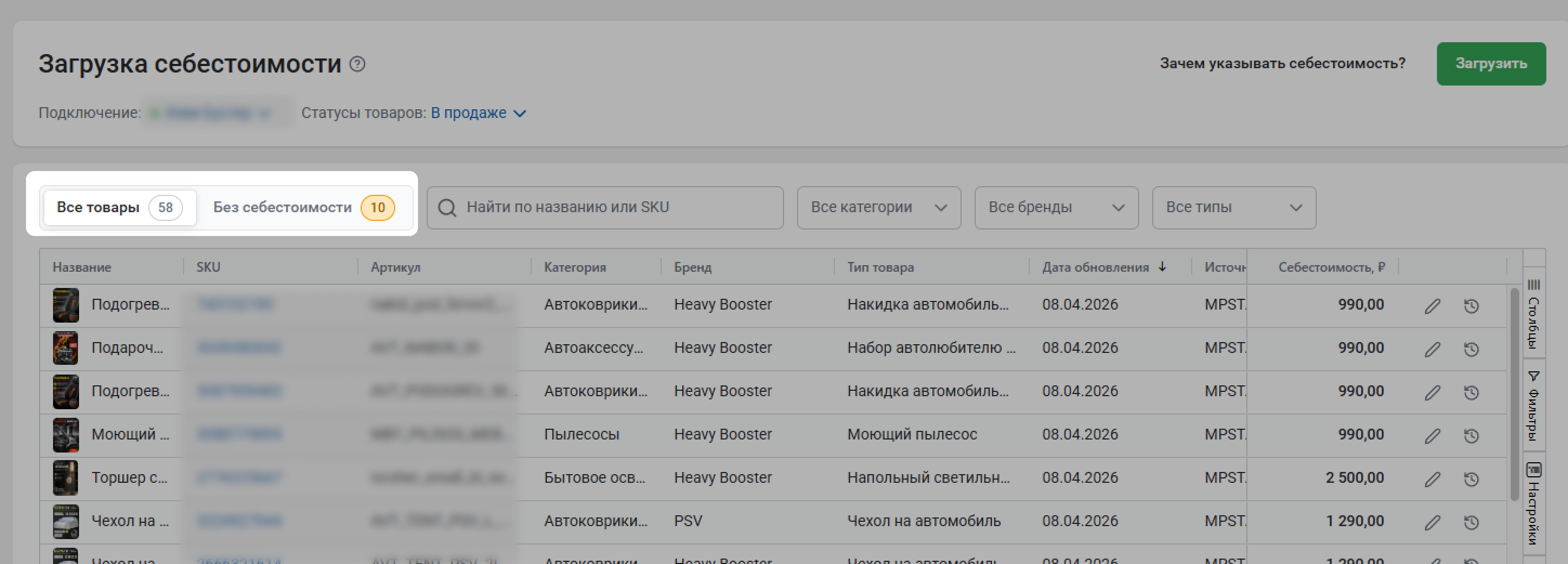 В списке можно просматривать все товары из вашего кабинета или только товары без себестоимости – для этого переключайтесь между вкладками.