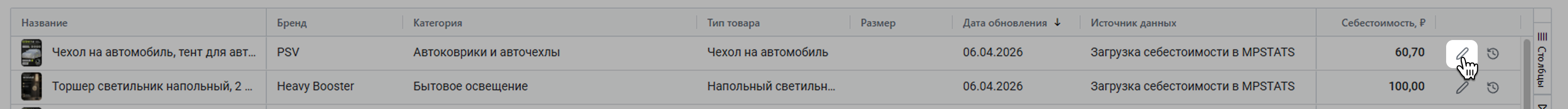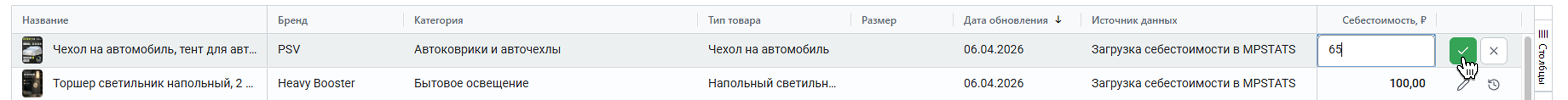 Вы можете изменить себестоимость отдельного товара прямо в этой таблице. Нажмите на иконку карандаша или дважды щелкните по ячейке.