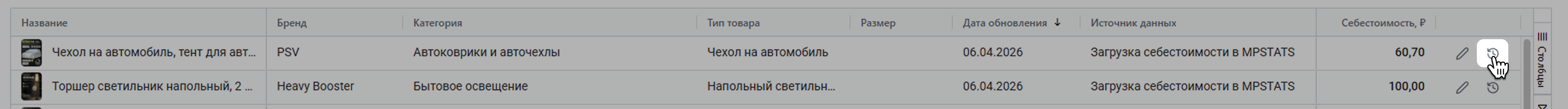 Чтобы посмотреть, как менялась себестоимость товара, нажмите на иконку часов.