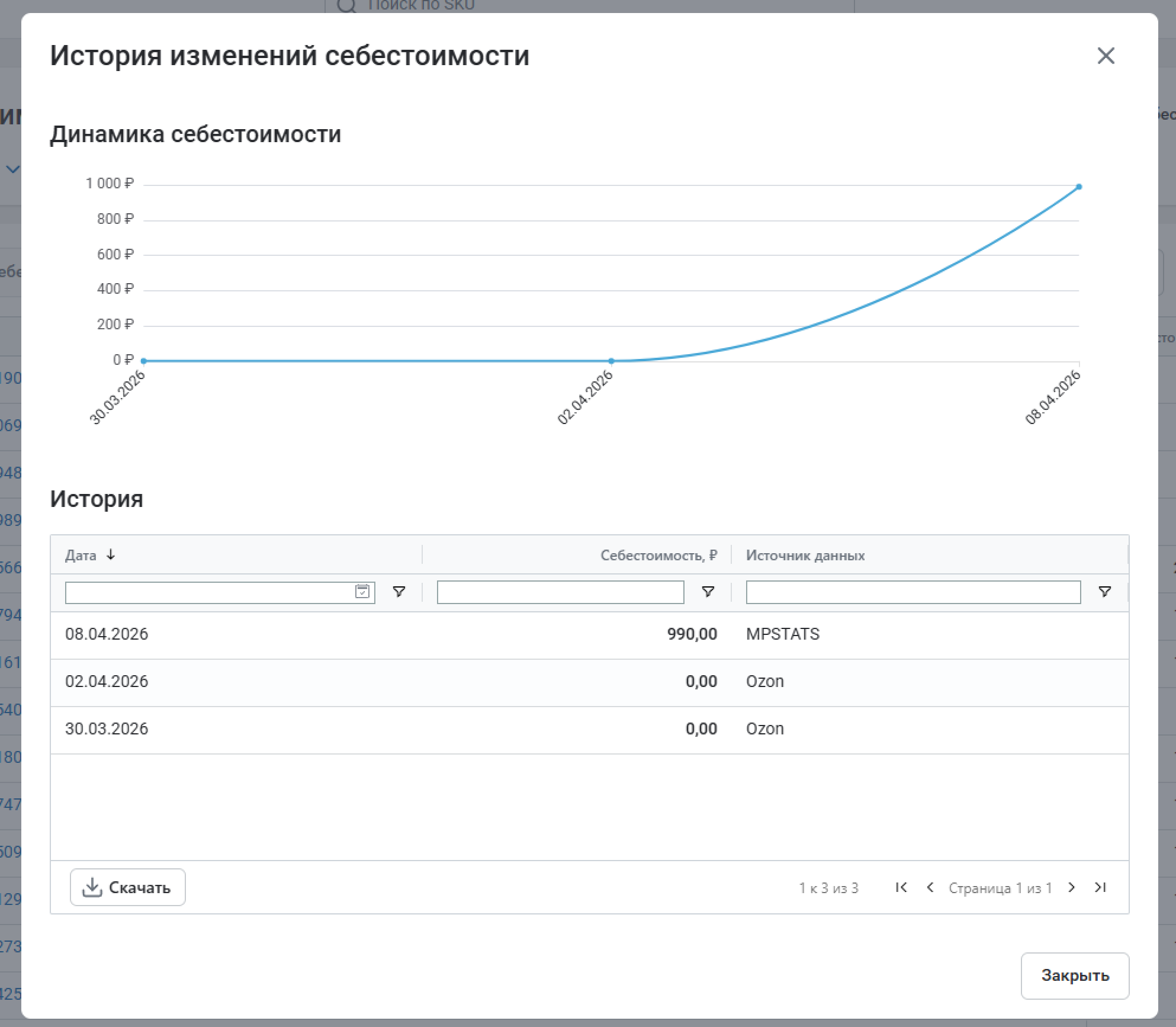 На графике показана динамика себестоимости по дням. В таблице вы найдете более подробные сведения об изменении себестоимости: