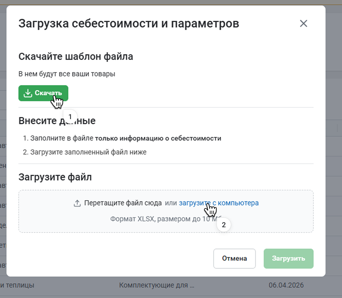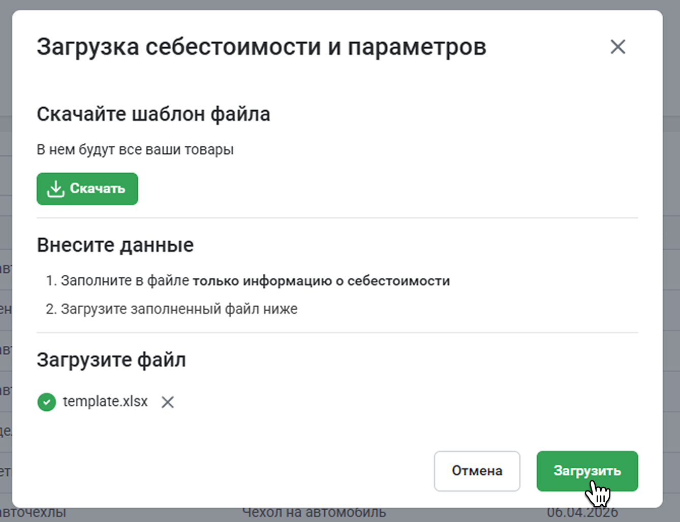 Вы сможете загрузить данные в таблице формата .xlsx или добавить себестоимость в инструменте вручную.