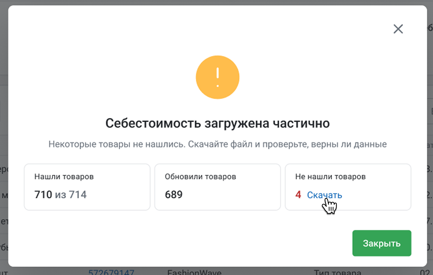 Если мы что-то не смогли распознать – вы можете скачать файл со всеми товарами, которые не нашла система. Попробуйте загрузить их снова.