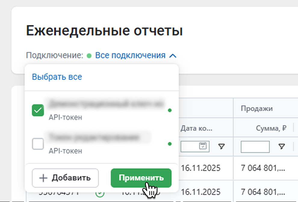 Вы можете посмотреть отчеты по всем своим подключениям или выбрать определенные. Для этого нажмите на кнопку в левом верхнем углу, отметьте нужные токены галочками и нажмите Применить.
