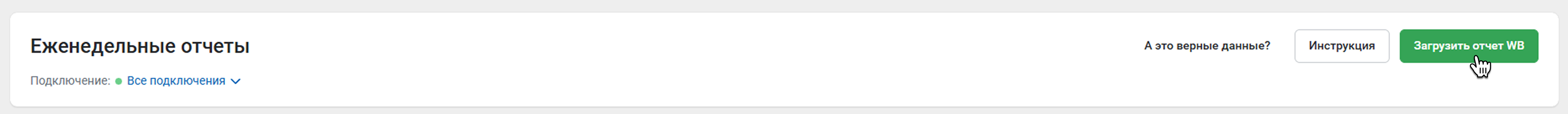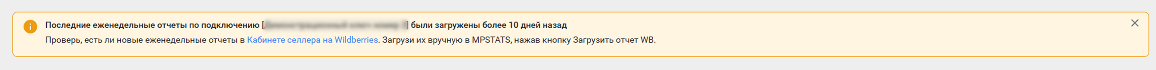 Иногда могут случаться сбои, в результате которых отчеты не передаются автоматически. Если Wildberries не передает отчет больше 10 дней, мы покажем предупреждение на страницах Сводка и Еженедельные отчеты. В этом случае вам нужно будет добавить новый отчет вручную.