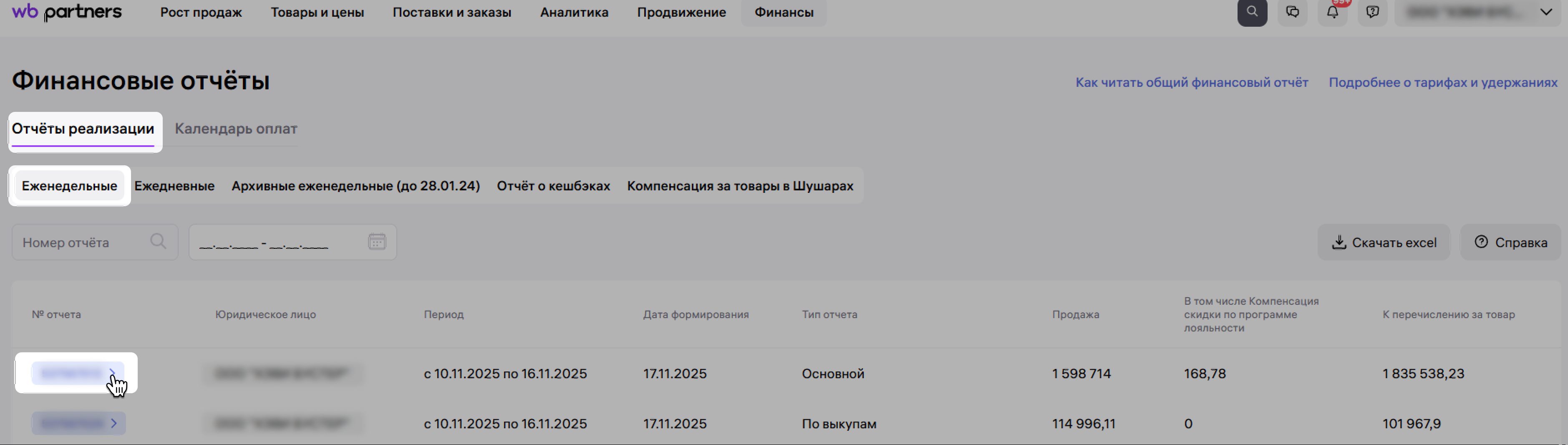 Скачайте еженедельный отчет из Кабинета селлера. Для этого на странице Финансовые отчеты зайдите во вкладку Еженедельные. В строке с последним еженедельным отчетом нажмите на его номер.