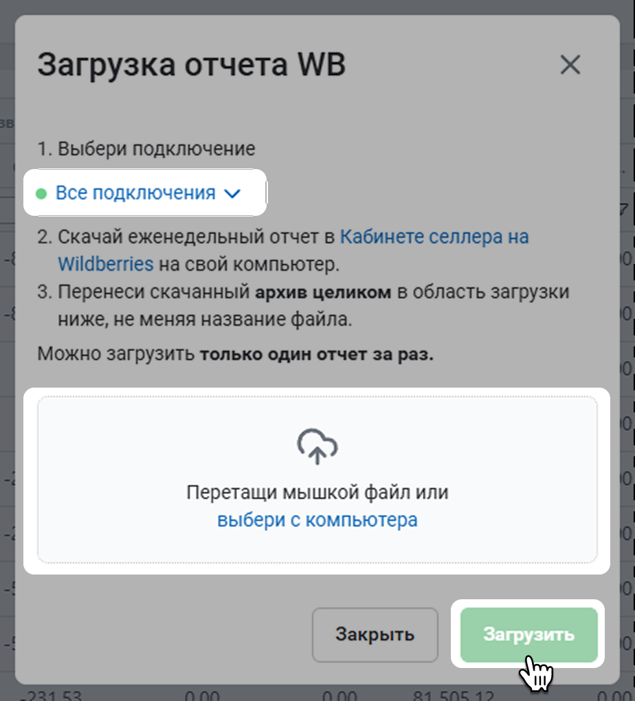 Выберите нужное подключение, перетащите скачанный из Кабинета селлера архив с отчетом в область загрузки и нажмите Загрузить.