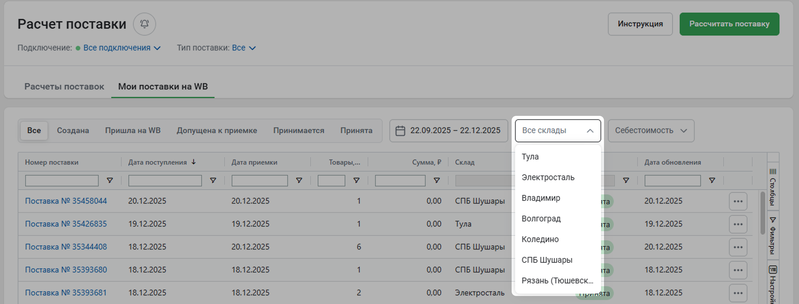 Чтобы попасть в инструмент, зайдите в Расчет поставки 2.0 и переключитесь на вкладку Мои поставки на WB.