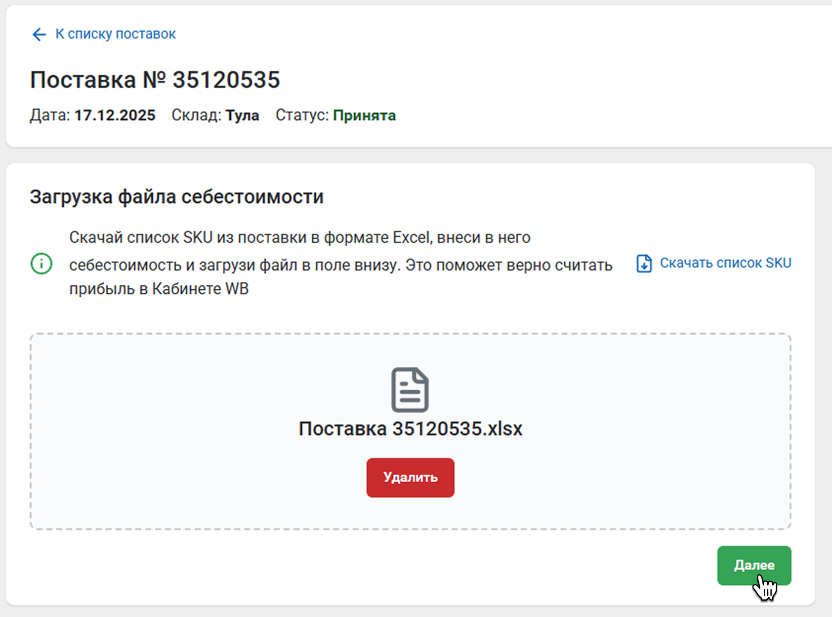 Чтобы загрузить себестоимость в Мои поставки, нажмите Сохранить. Данные появятся в общей таблице.