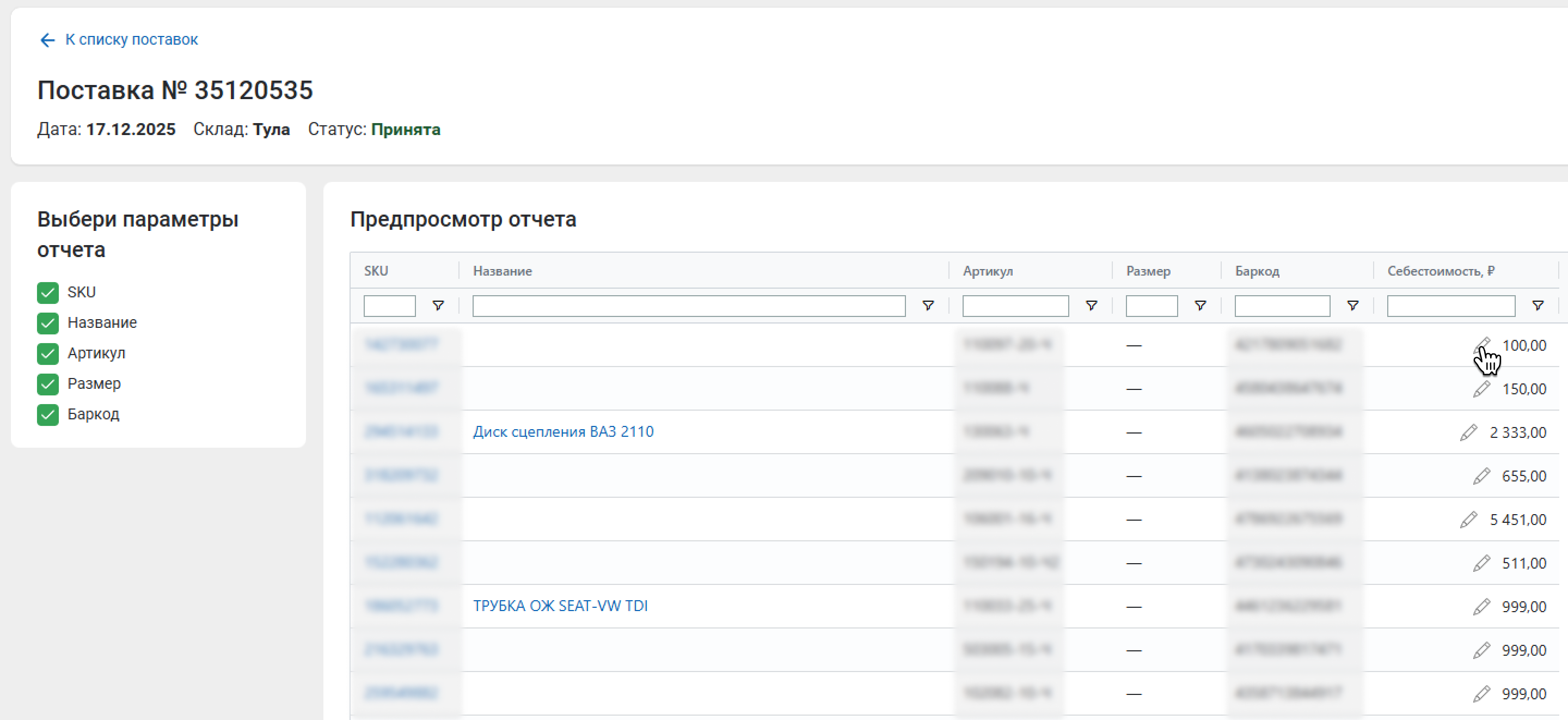 Слева от таблицы можно выбрать параметры, которые будут выводиться в финальном отчете (SKU, Название, Артикул, Баркод, Размер).