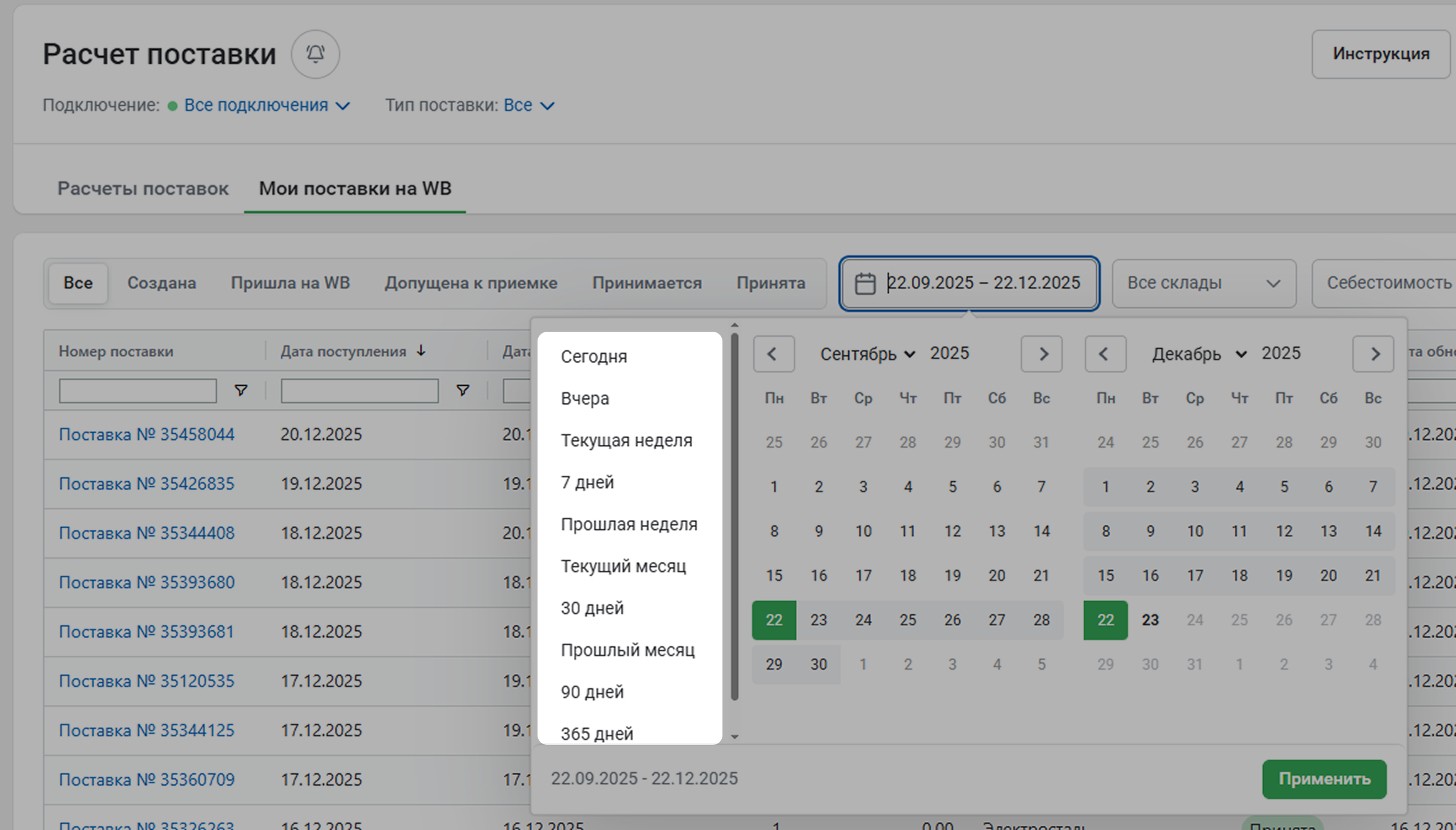 Чтобы просмотреть поставки за конкретный период, нажмите на иконку календаря. Выберите нужные даты и нажмите Применить.