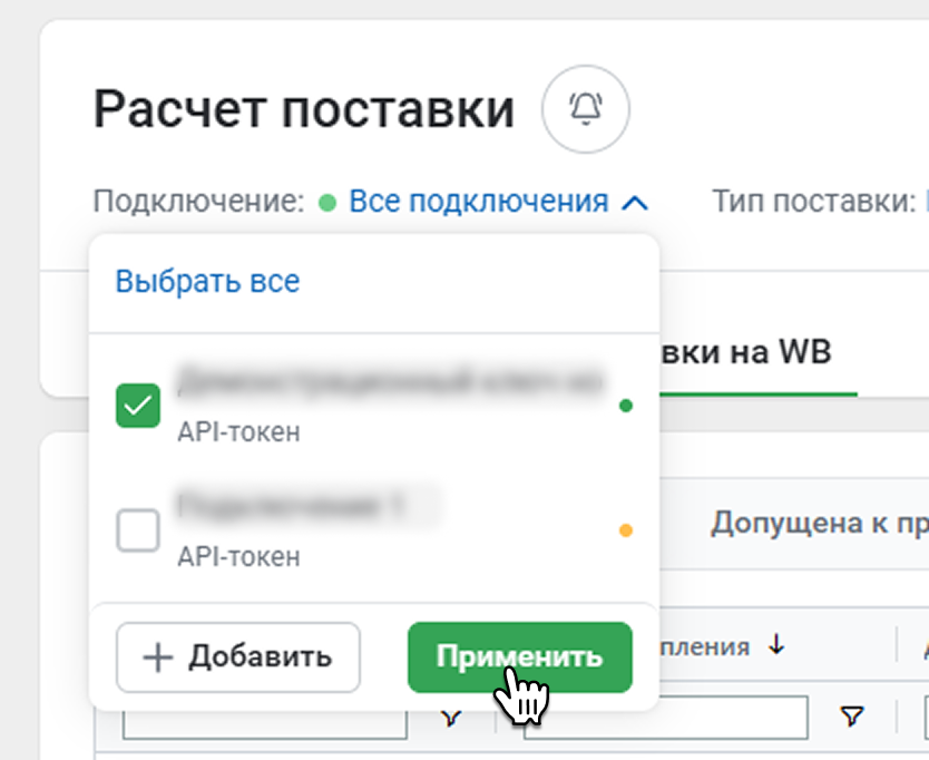 Если у вас несколько подключений, можно выбрать, по какому из них смотреть поставки. Отметьте галочками нужные токены и нажмите Применить.