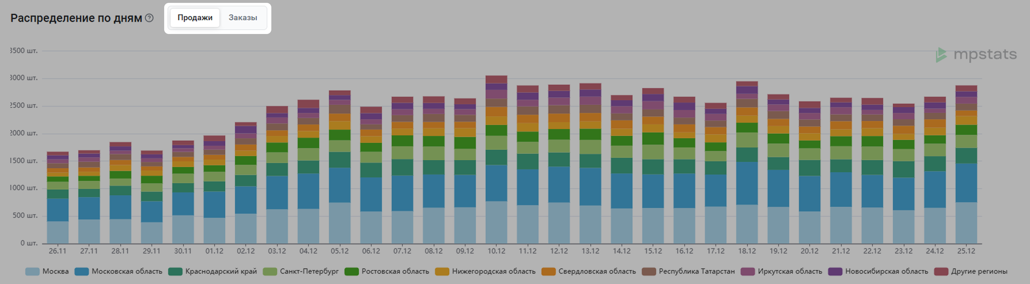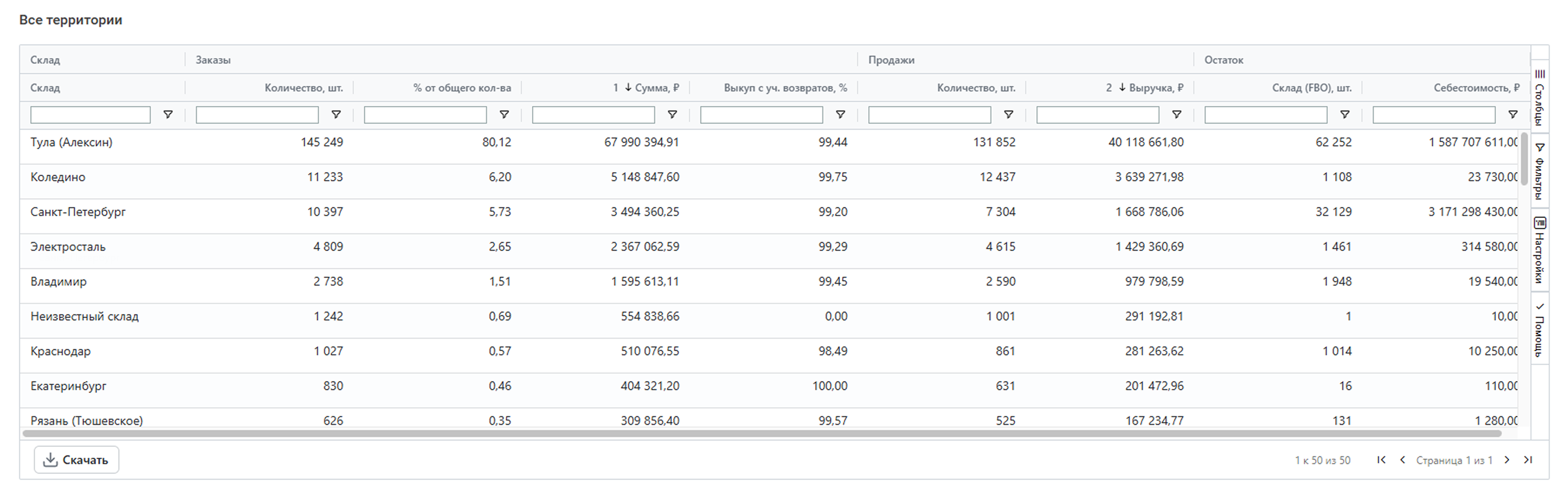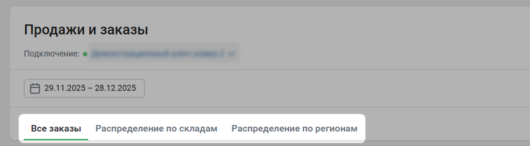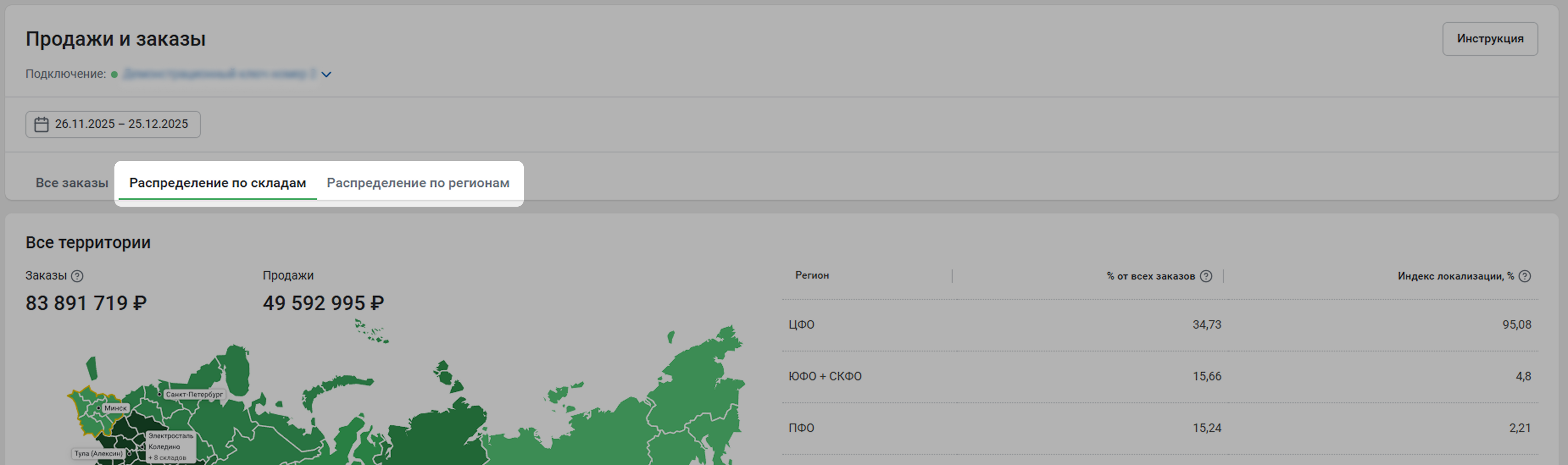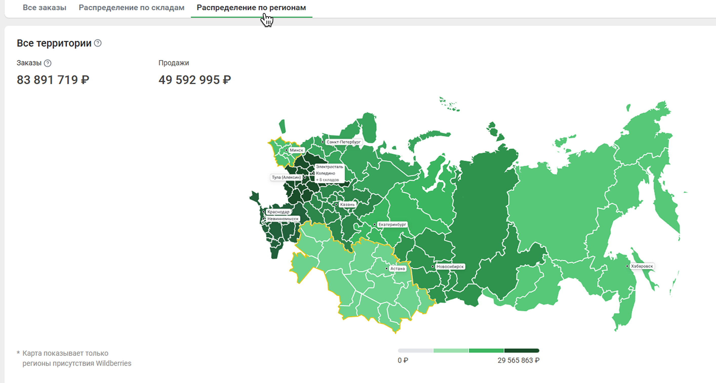 Подробные данные о своих заказах вы найдете во вкладке Все заказы. Посмотреть географию ваших заказов можно во вкладках Распределение по складам и Распределение по регионам.