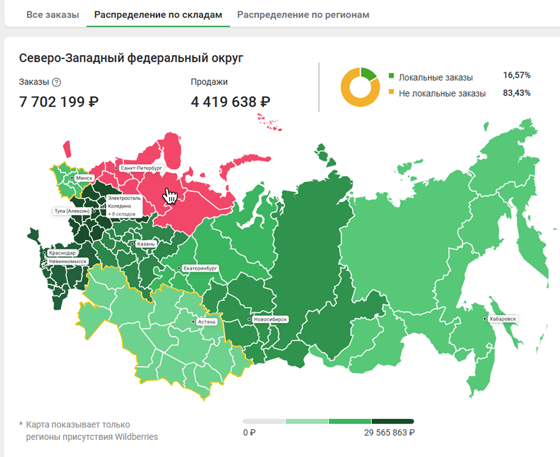 Если вы выберете конкретный склад, сможете увидеть распределение локальных и не локальных заказов – сколько товаров с этого склада было доставлено в пределах того же региона, где они и были заказаны.