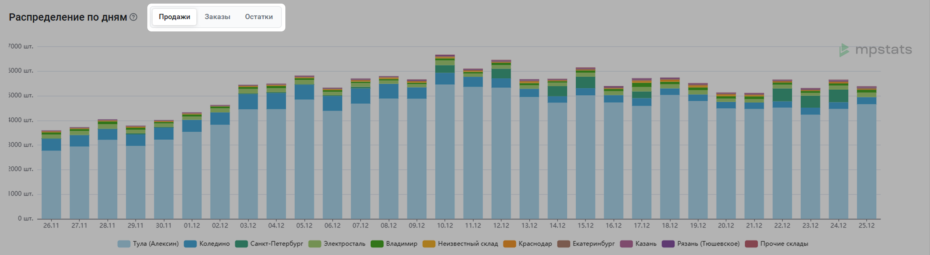 Во вкладке Распределение по складам вы увидите, как распределяются продажи ваших товаров по складам Wildberries.
