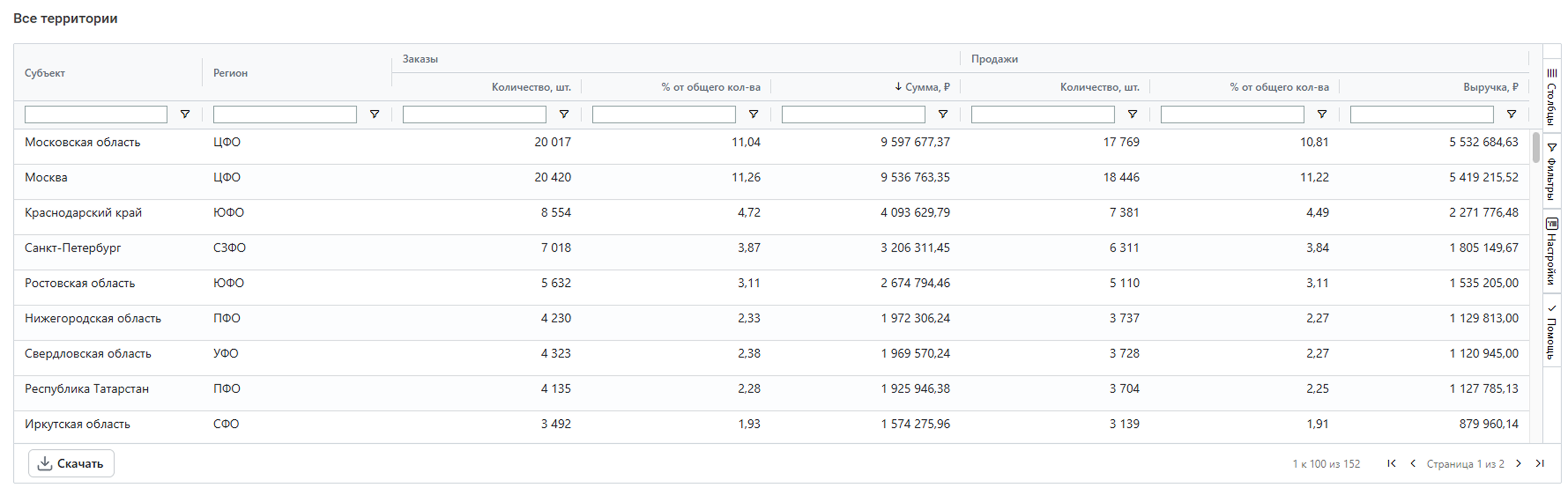 Пока на карте не выделен ни один регион, вы можете увидеть общую сумму заказов и продаж на всех территориях.
