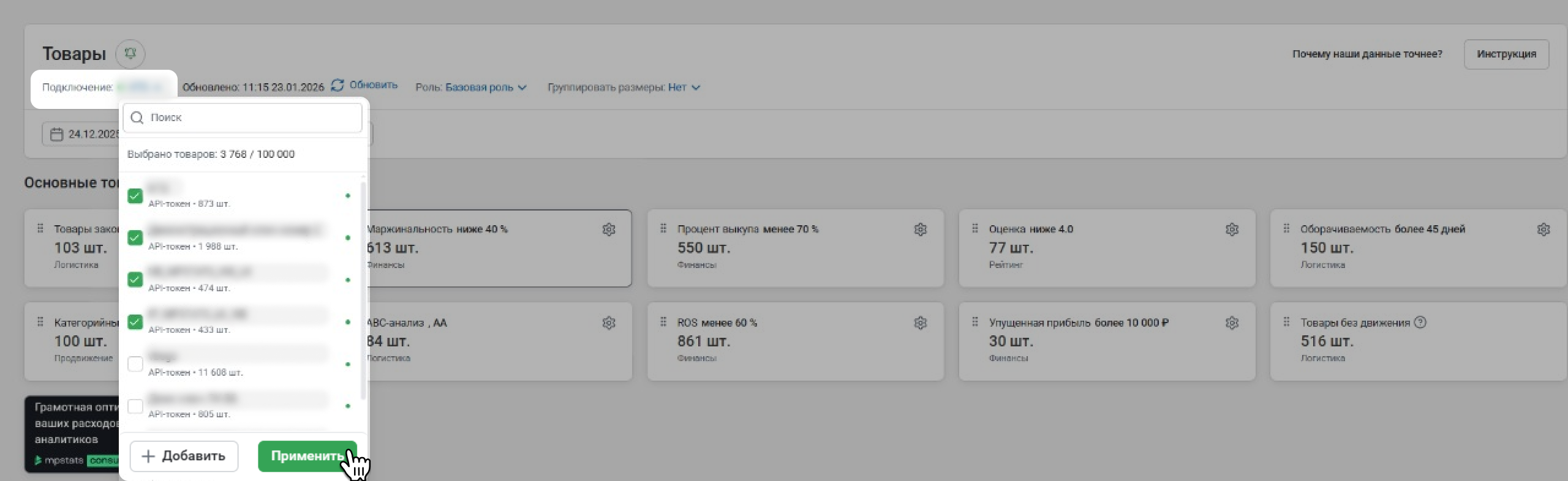 Выберите в списке слева подключение, по которому хотите посмотреть отчет. Если в вашем магазине больше 100 000 товаров, можно просматривать только одно подключение. Если в ваших магазинах меньше 100 000 товаров – можно просматривать данные сразу по нескольким подключениям. В этом случае общее число товаров по подключениям не должно превышать 100 000.