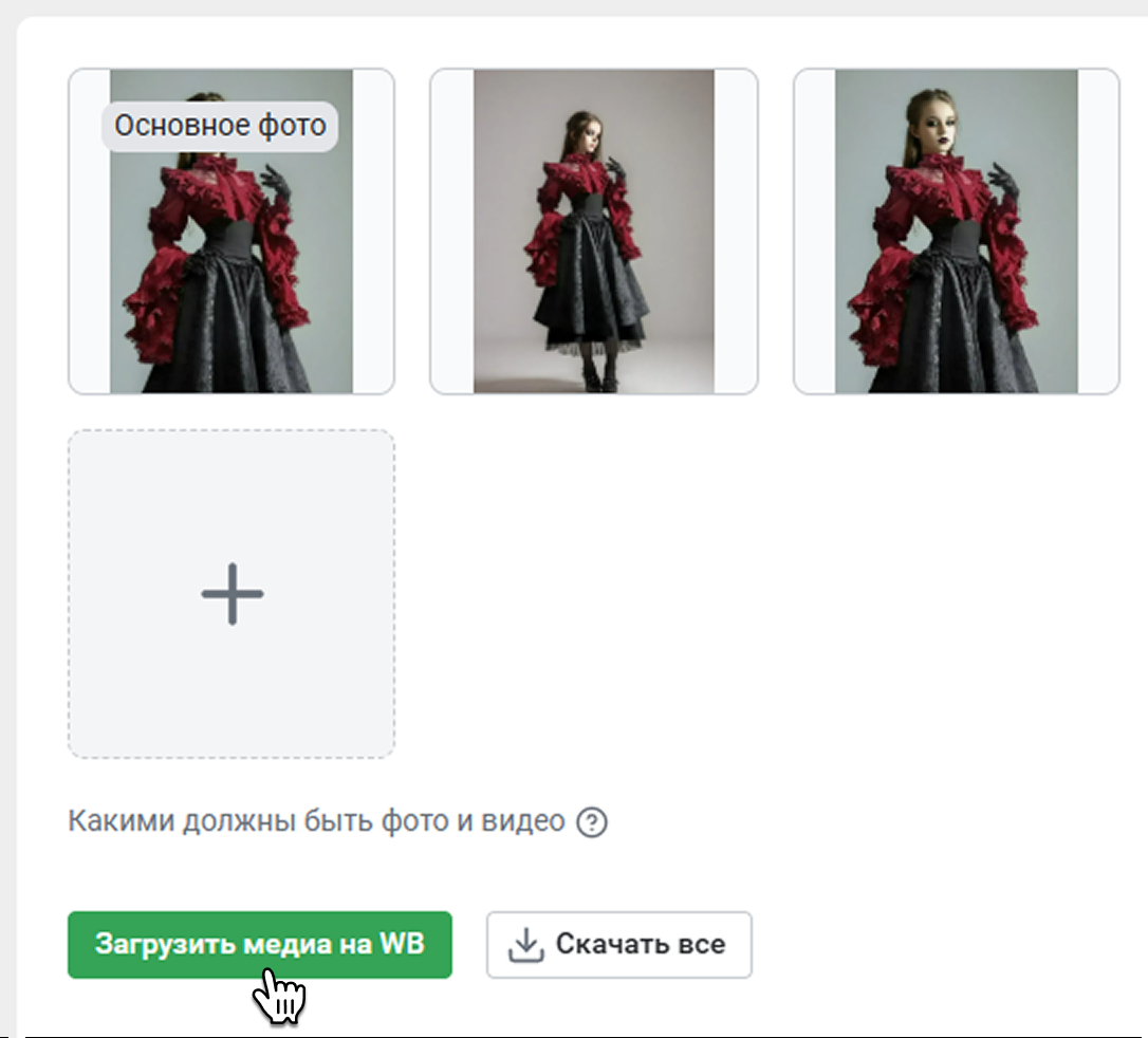 Чтобы обновить медиафайлы в карточке товара, нажмите Загрузить медиа на WB.