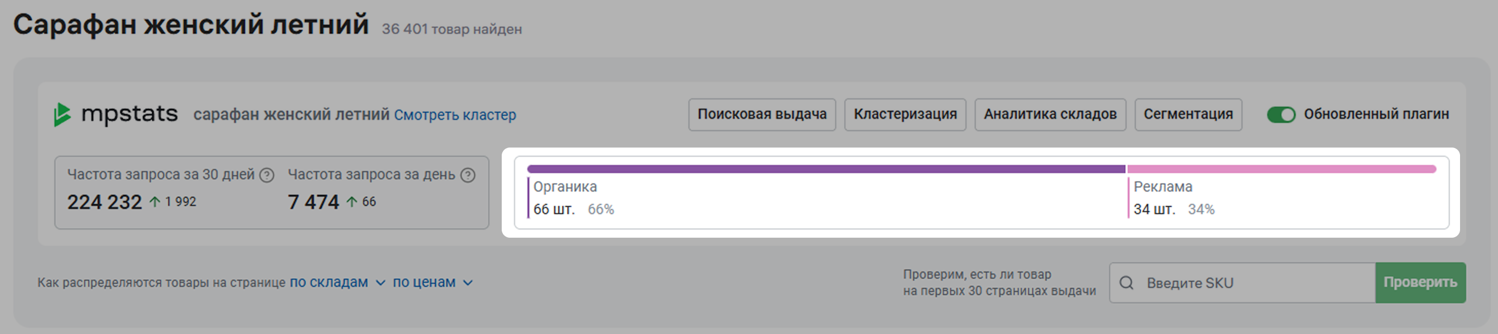 В плагине можно быстро оценить, много ли товаров продвигается в рекламе по запросу – показываем количество органических и рекламных позиций в выдаче.