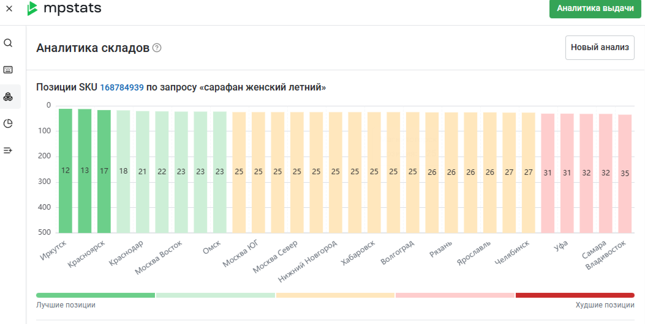 С помощью графика можно отследить, как влияет на позицию товара по регионам загрузка складов и другие факторы. Например, чтобы товар был в топе по всей Москве, нужно проверять его позицию сразу по нескольким регионам Москвы: Запад, Восток, Юг, Север, Центр. Так вы сможете грамотно распределять загрузку разных складов